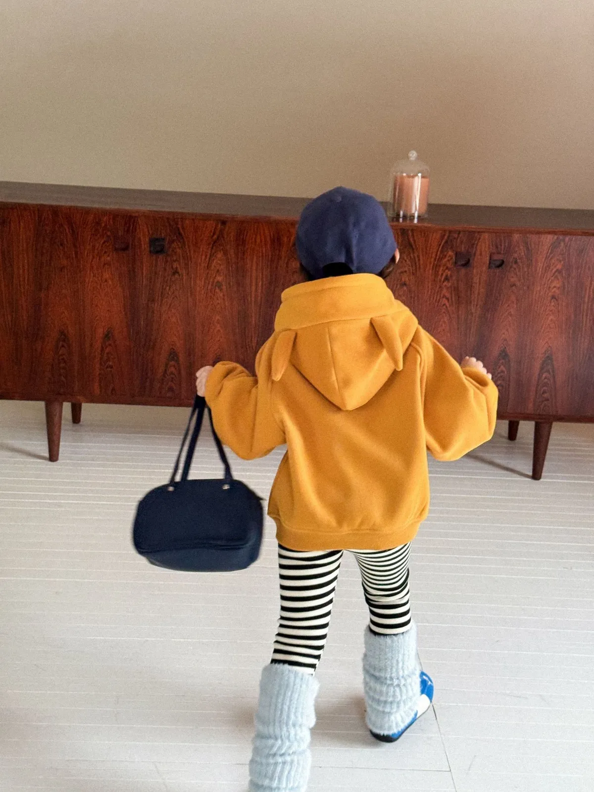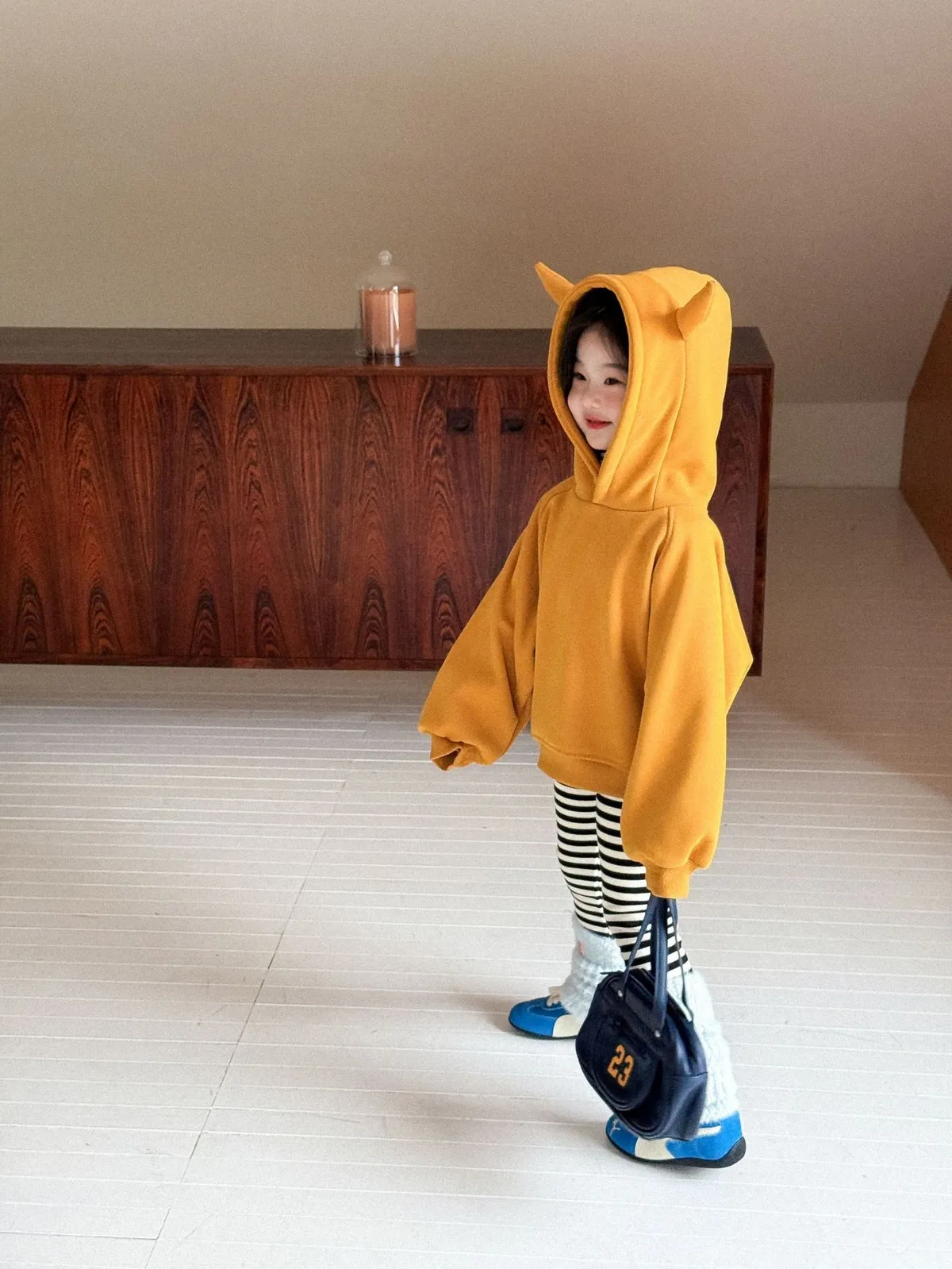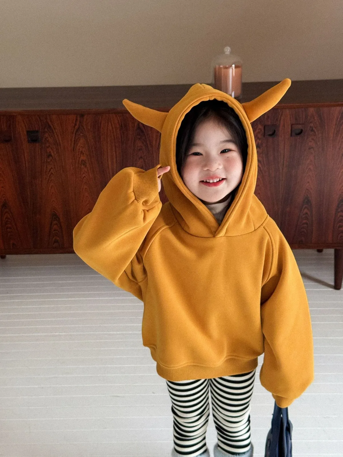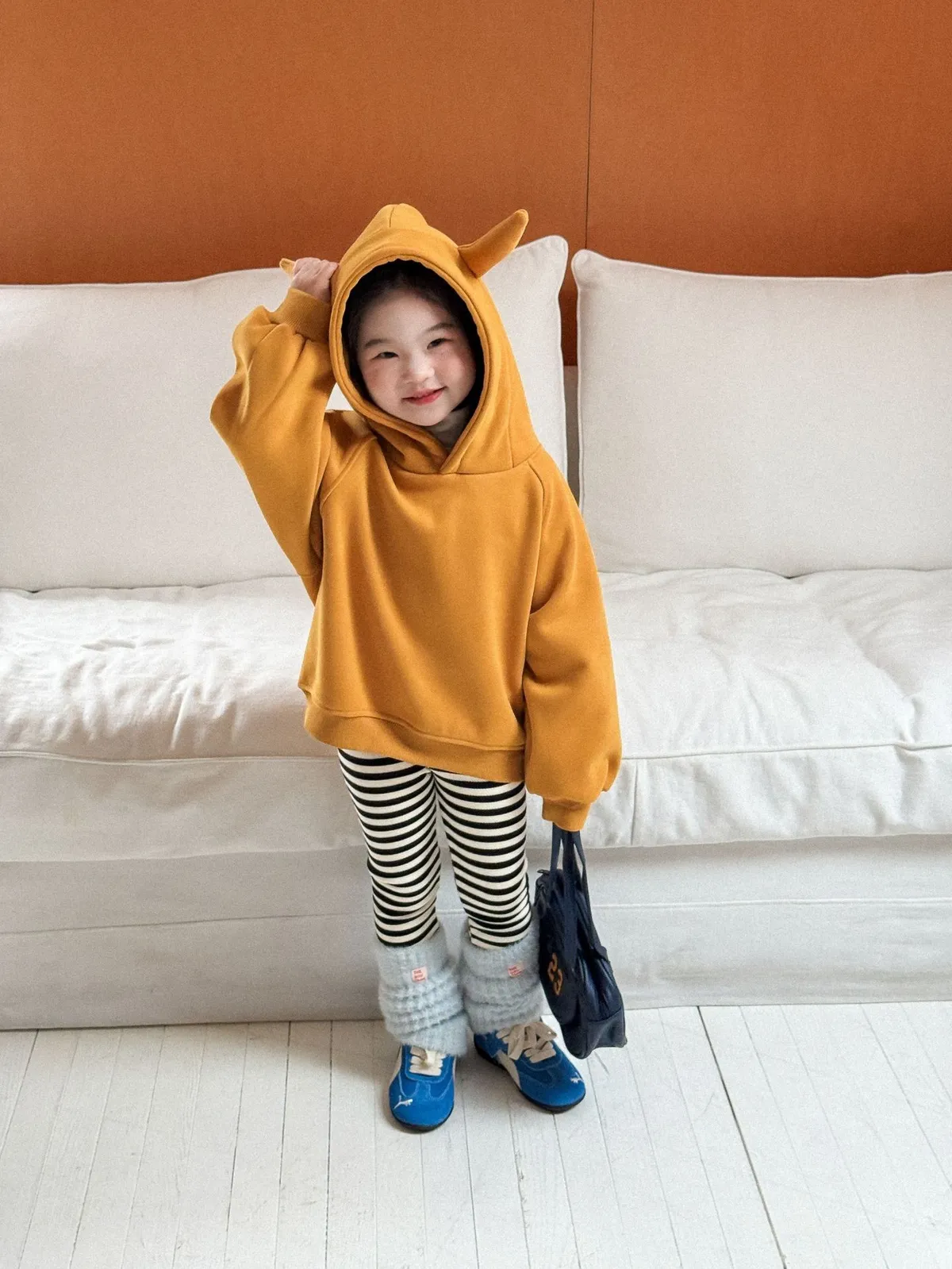 [90-140碼]加絨款#可愛尖尖惡魔角連帽上衣+條紋內搭褲套裝