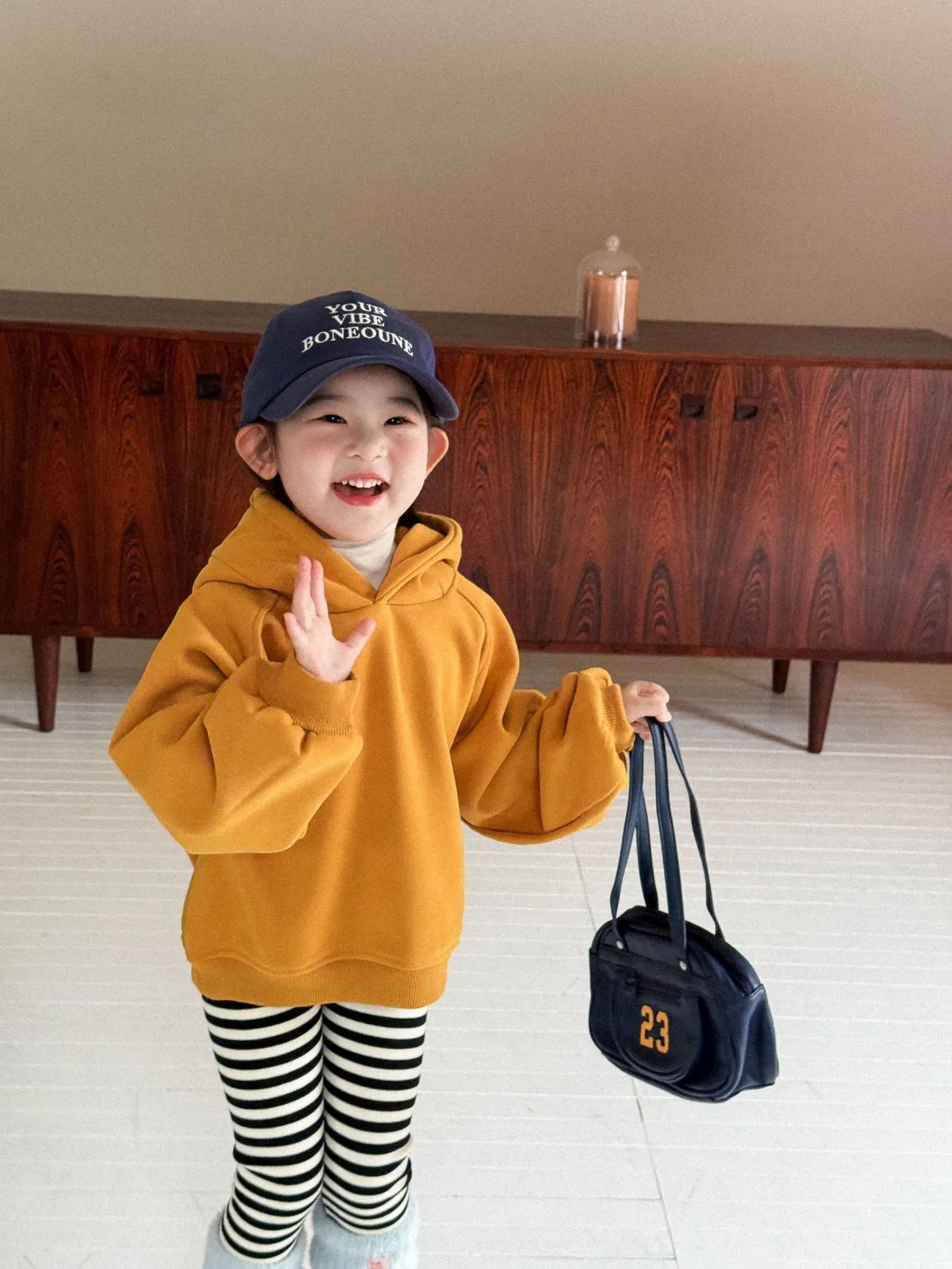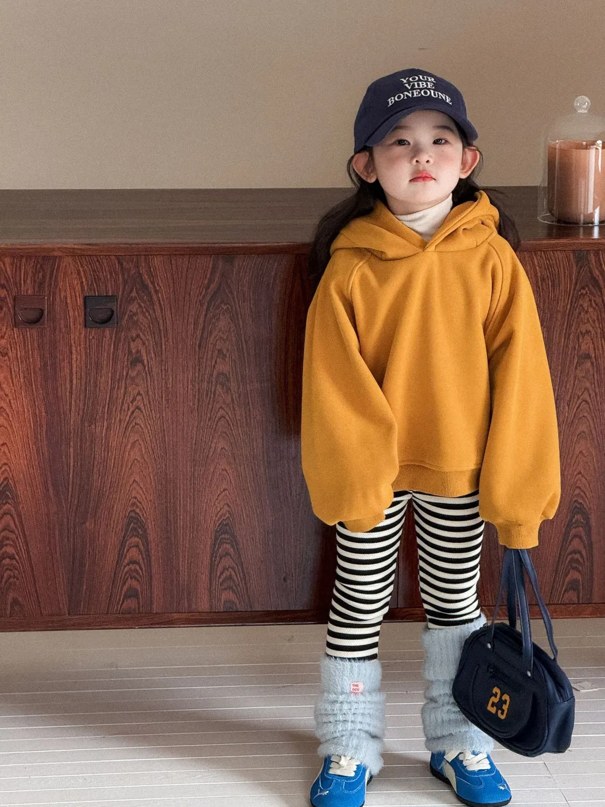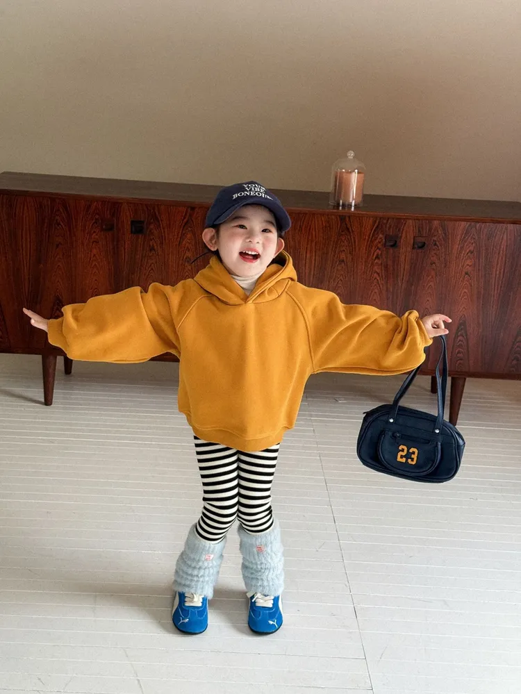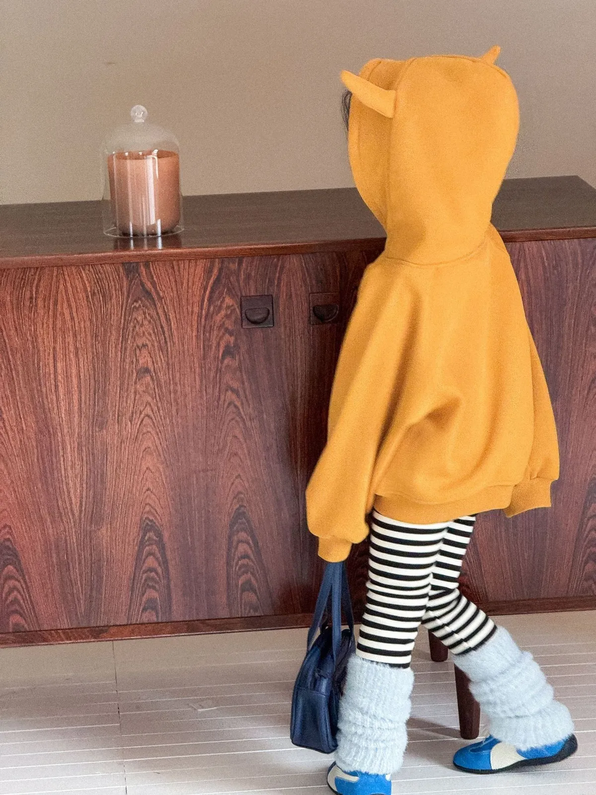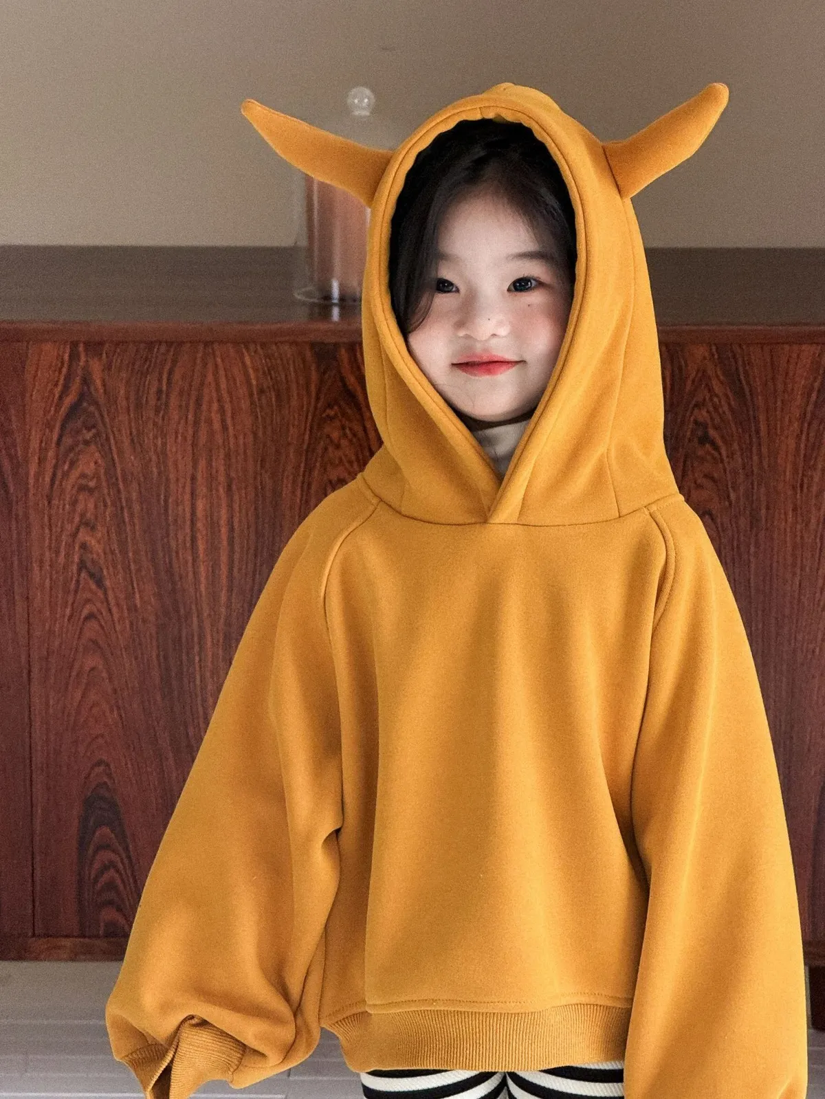 [90-140碼]加絨款#可愛尖尖惡魔角連帽上衣+條紋內搭褲套裝