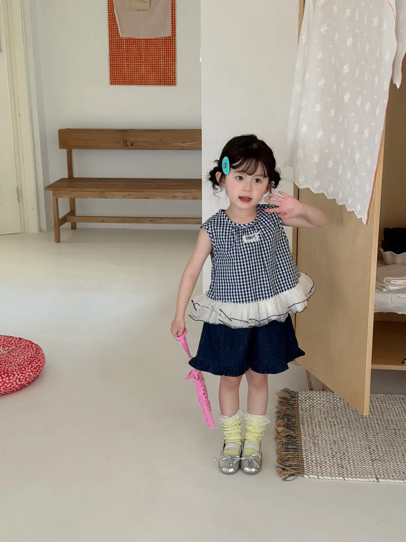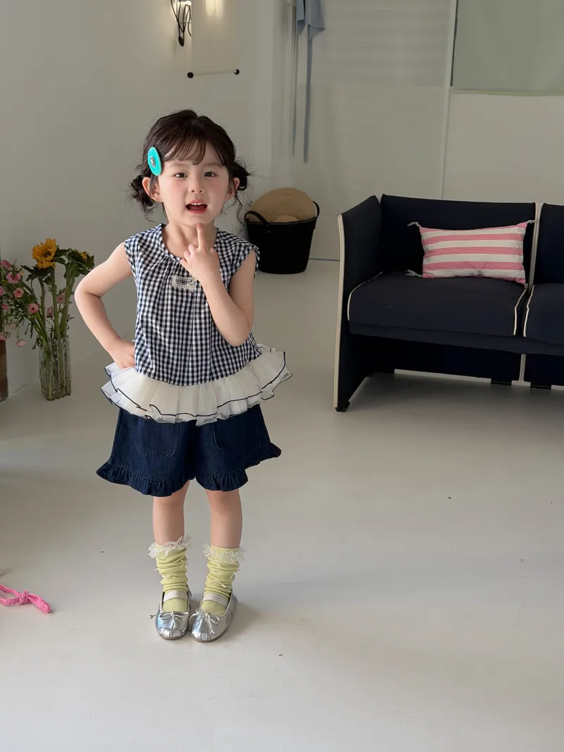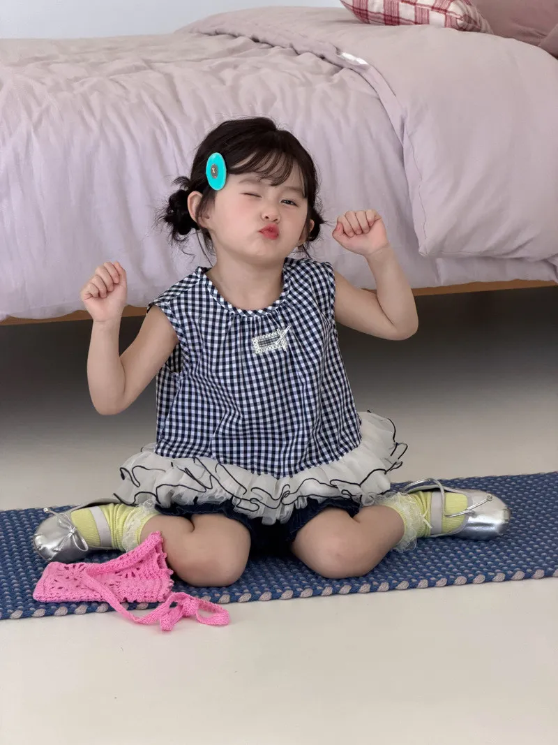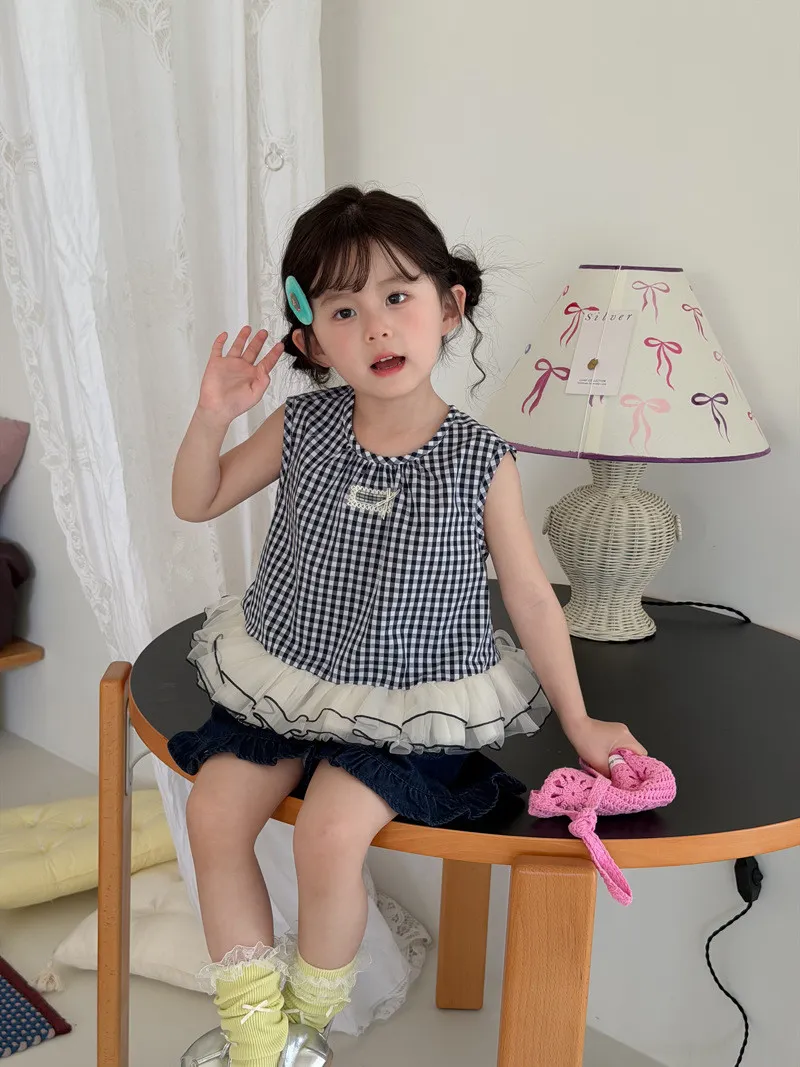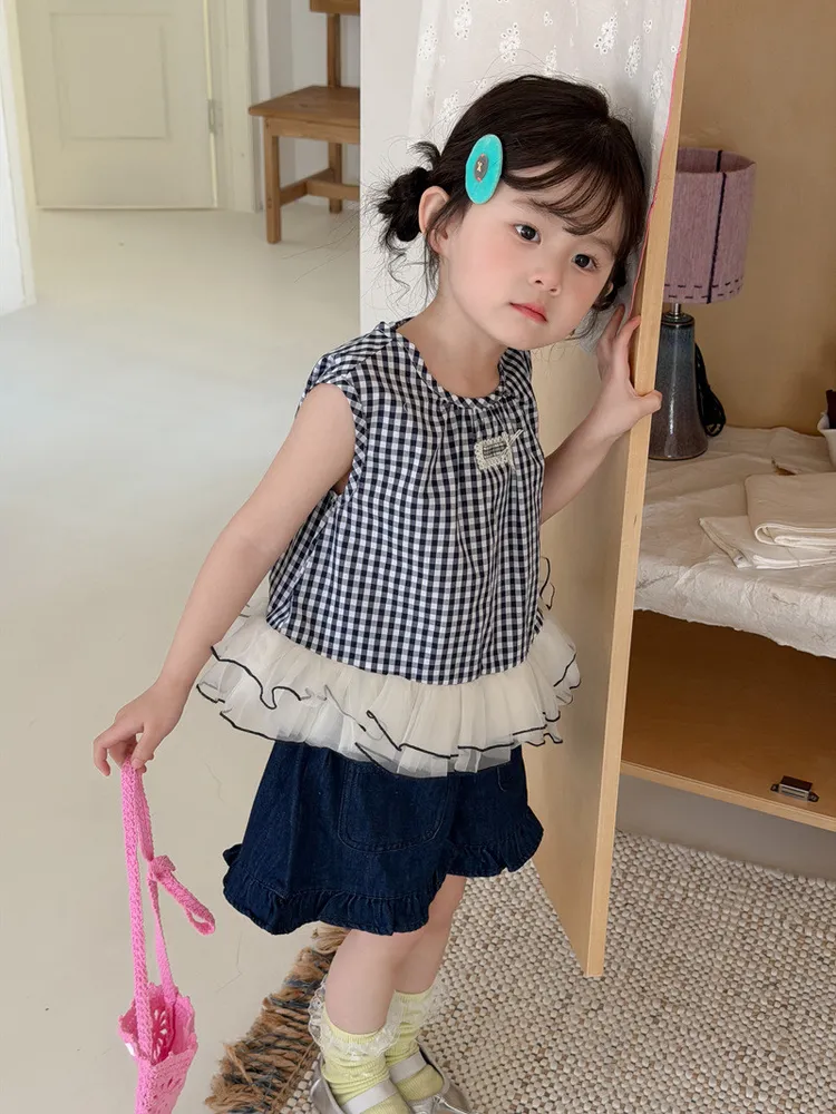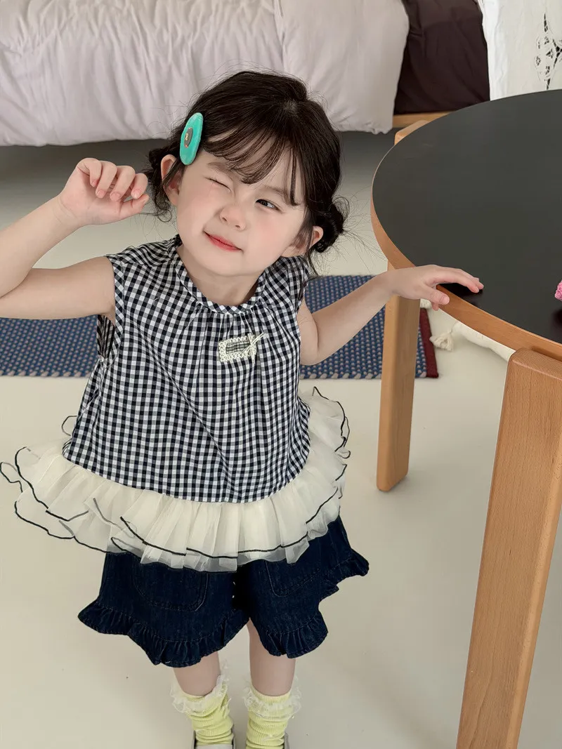 (90-140碼)甜美格紋拼網紗背心
