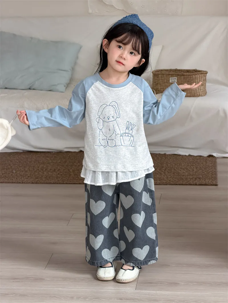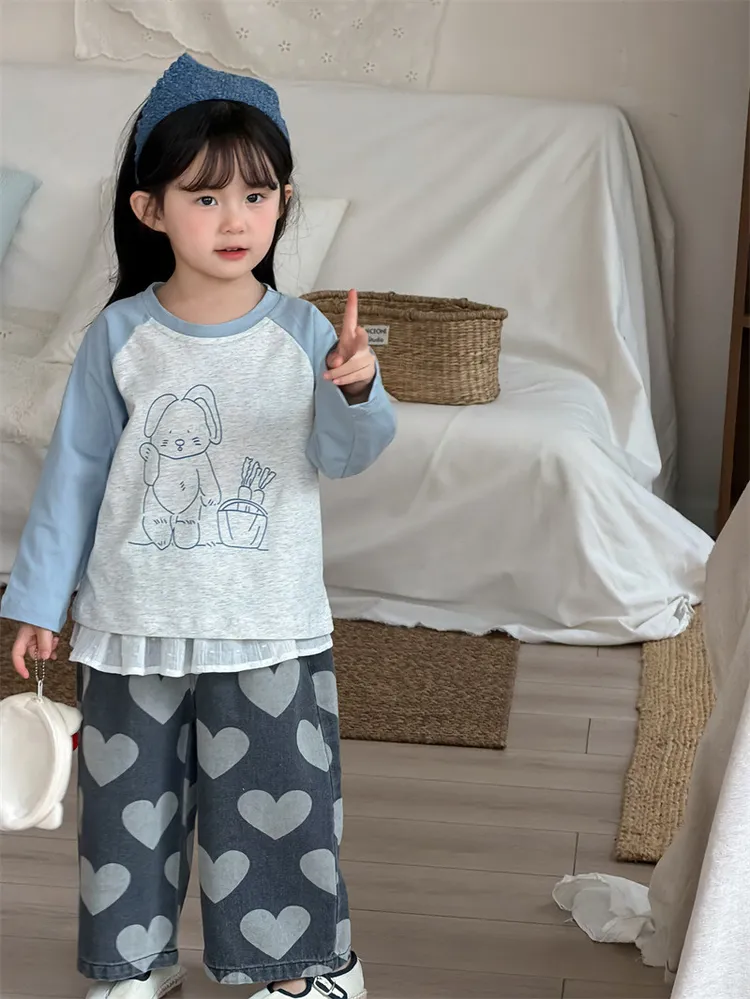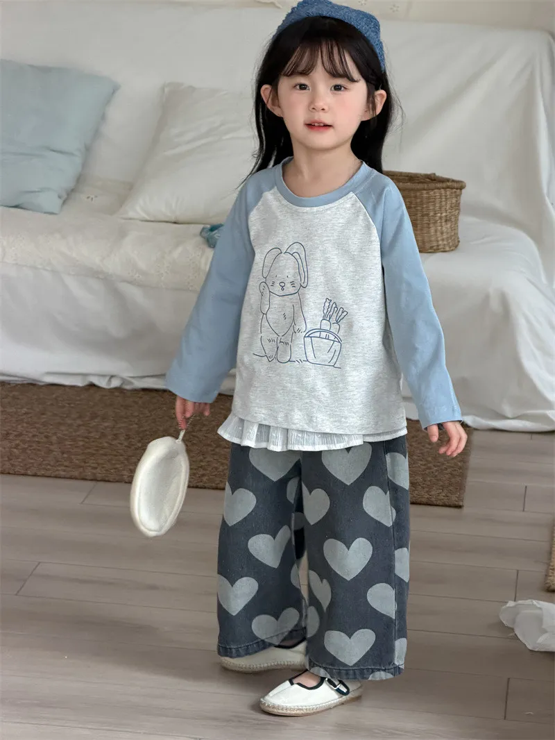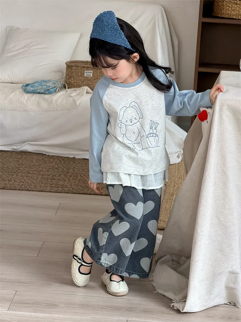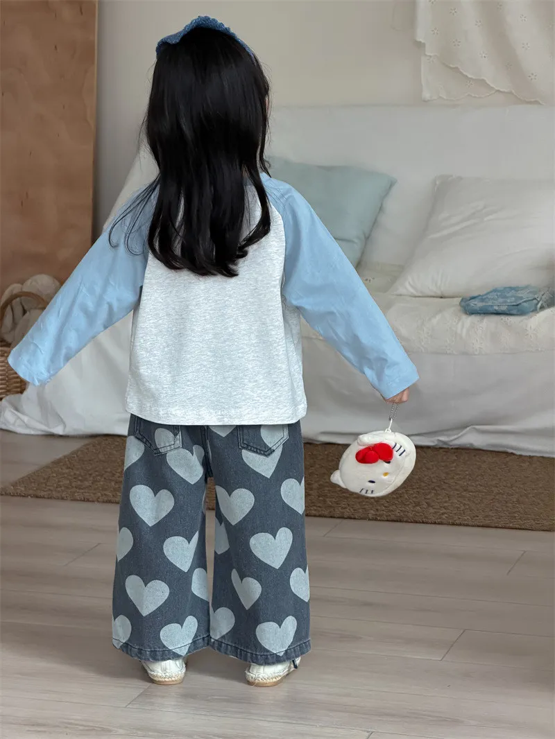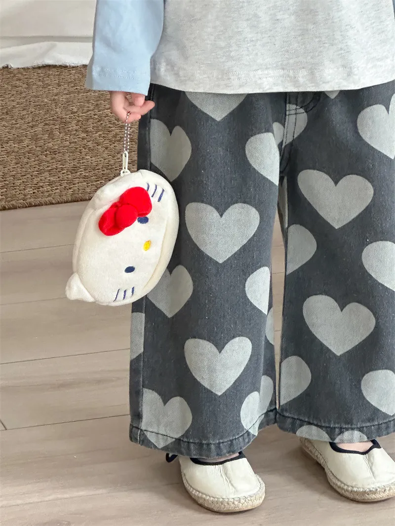 (90-130碼)俏皮滿版愛心牛仔寬褲