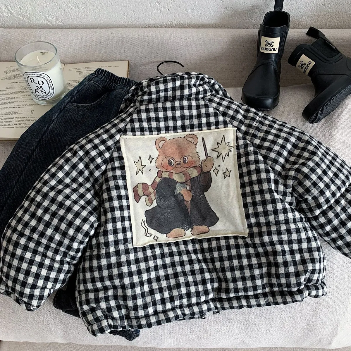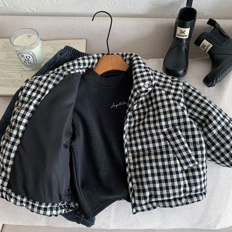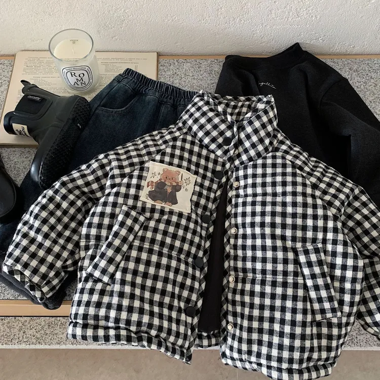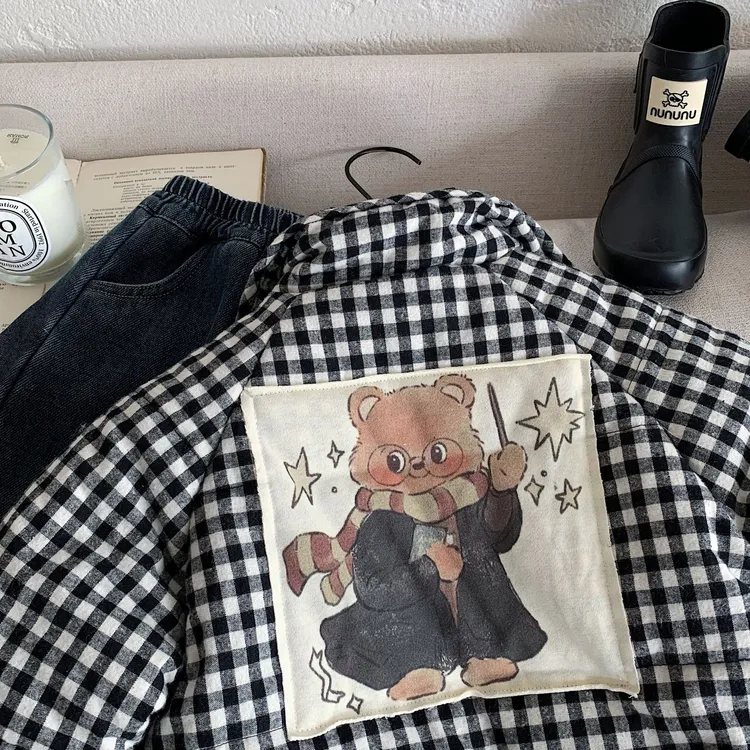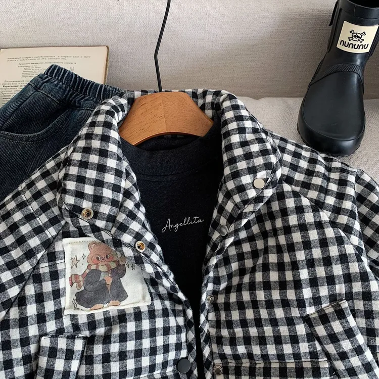 [90-140碼]加厚款#小熊X黑白格紋鋪棉外套