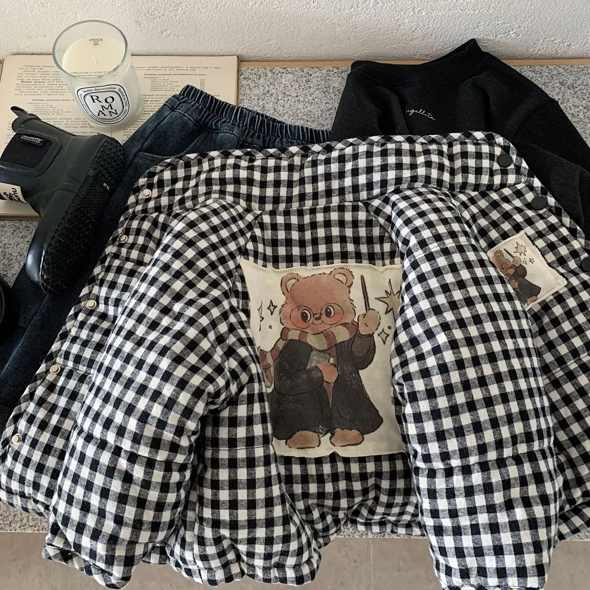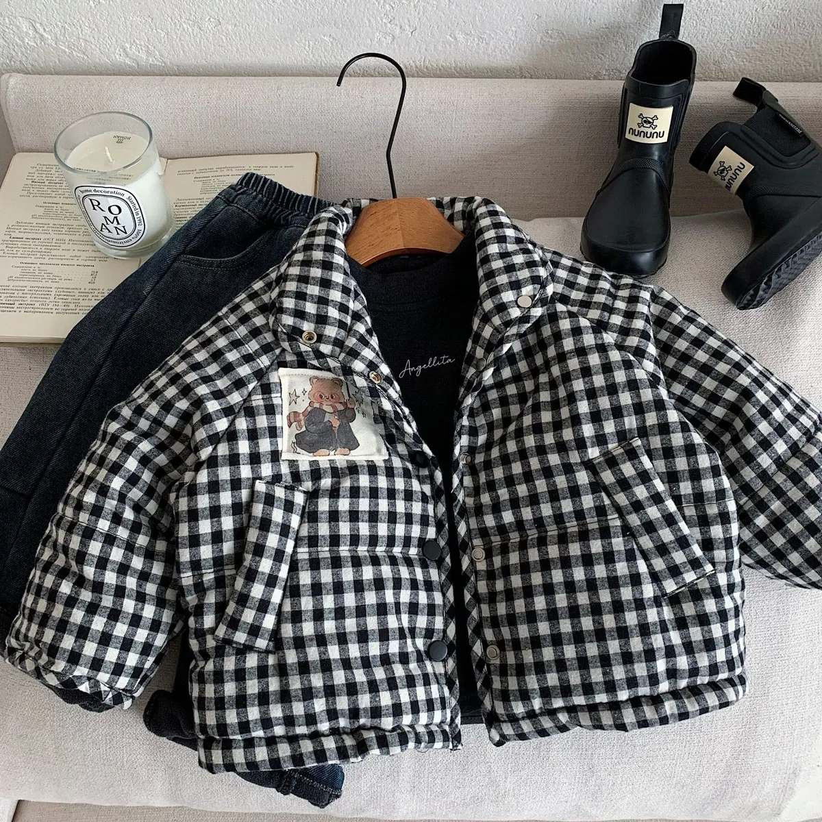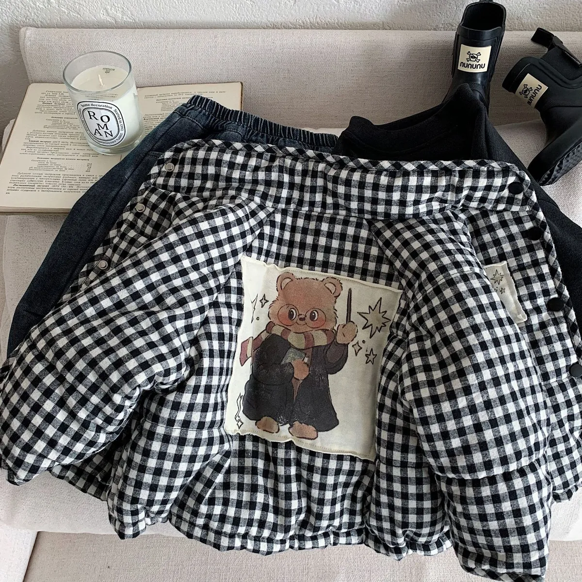 [90-140碼]加厚款#小熊X黑白格紋鋪棉外套