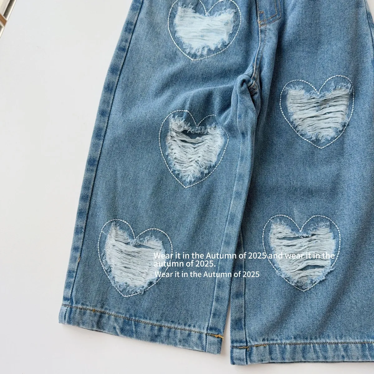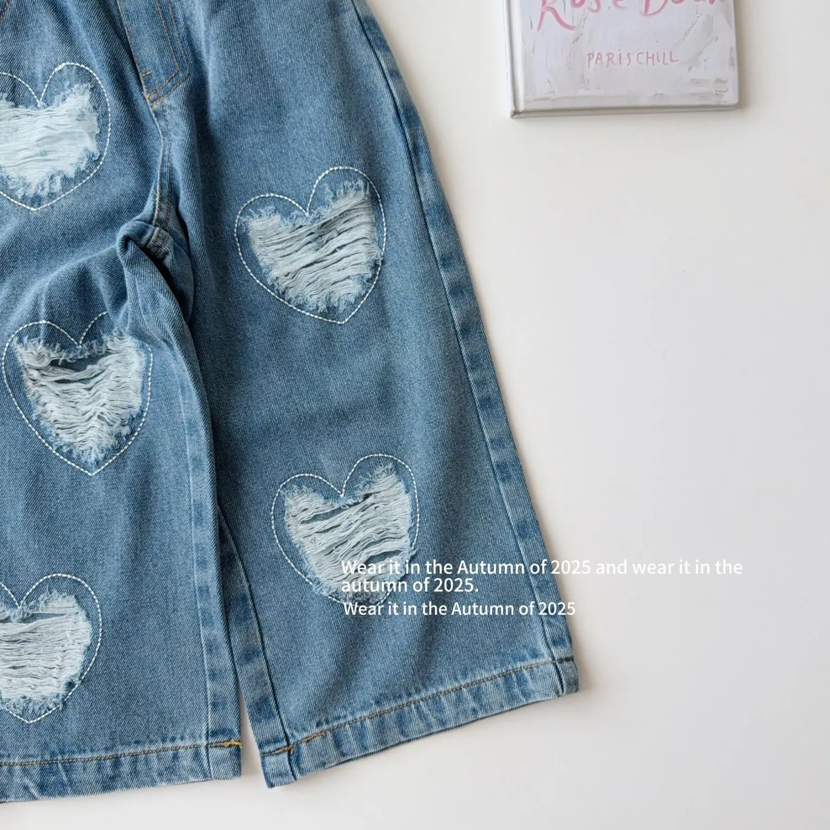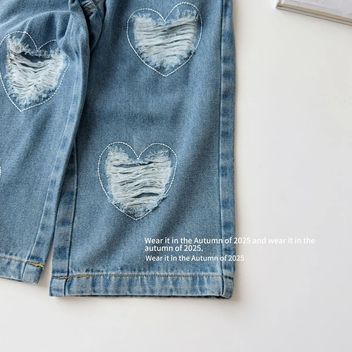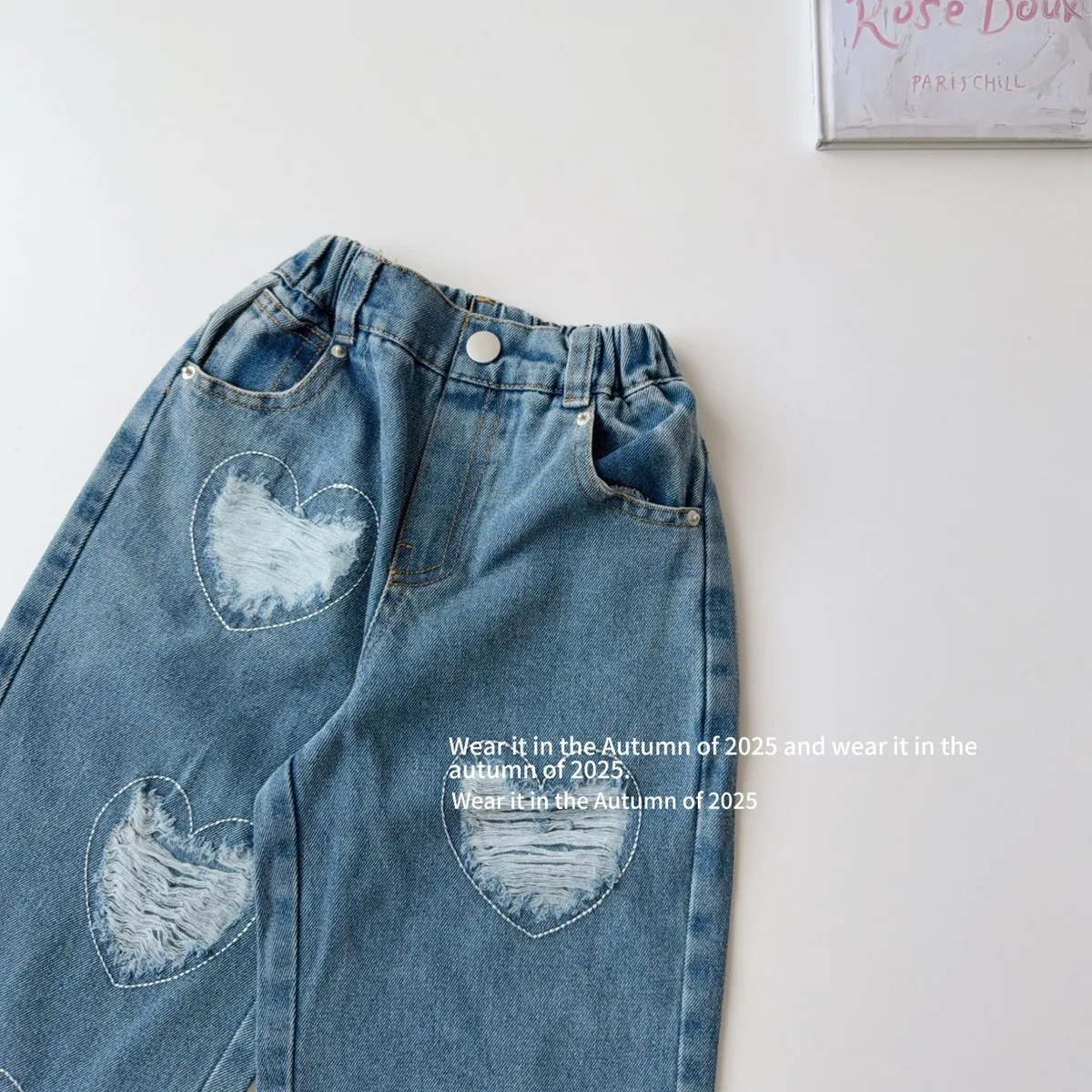 [90-150碼]設計感仿舊刷破愛心直筒褲