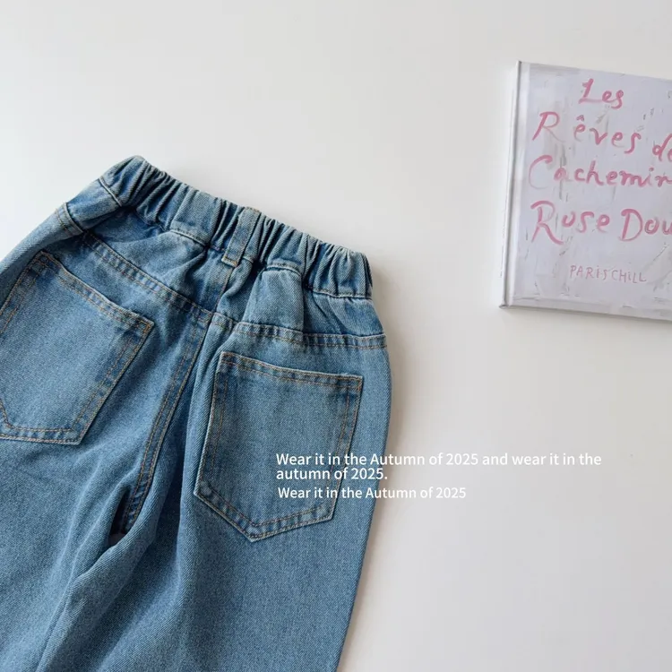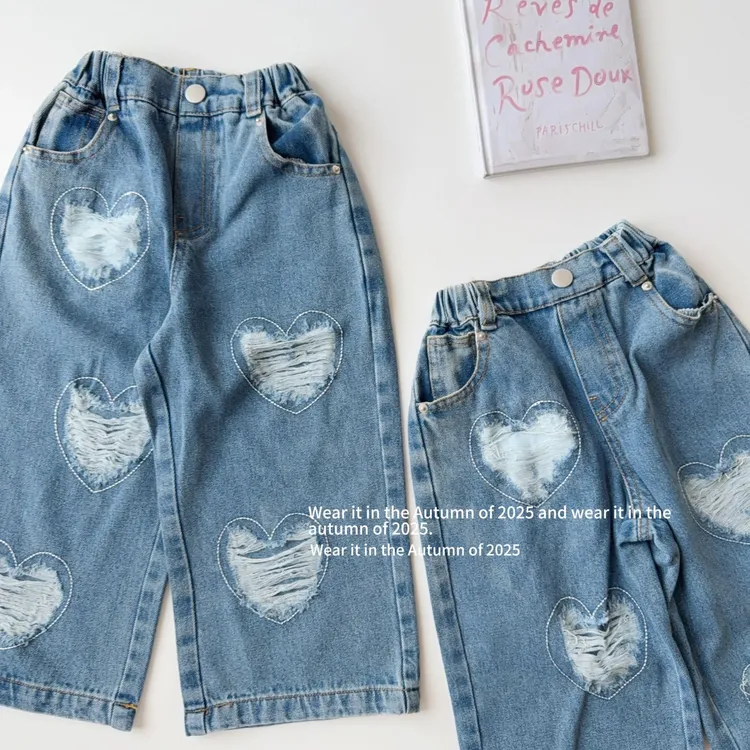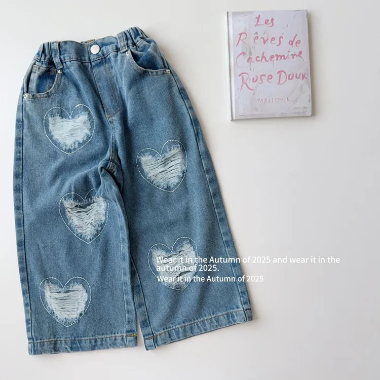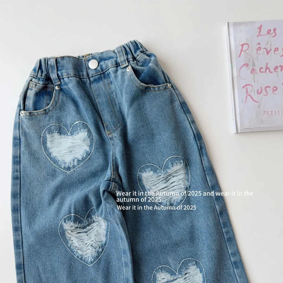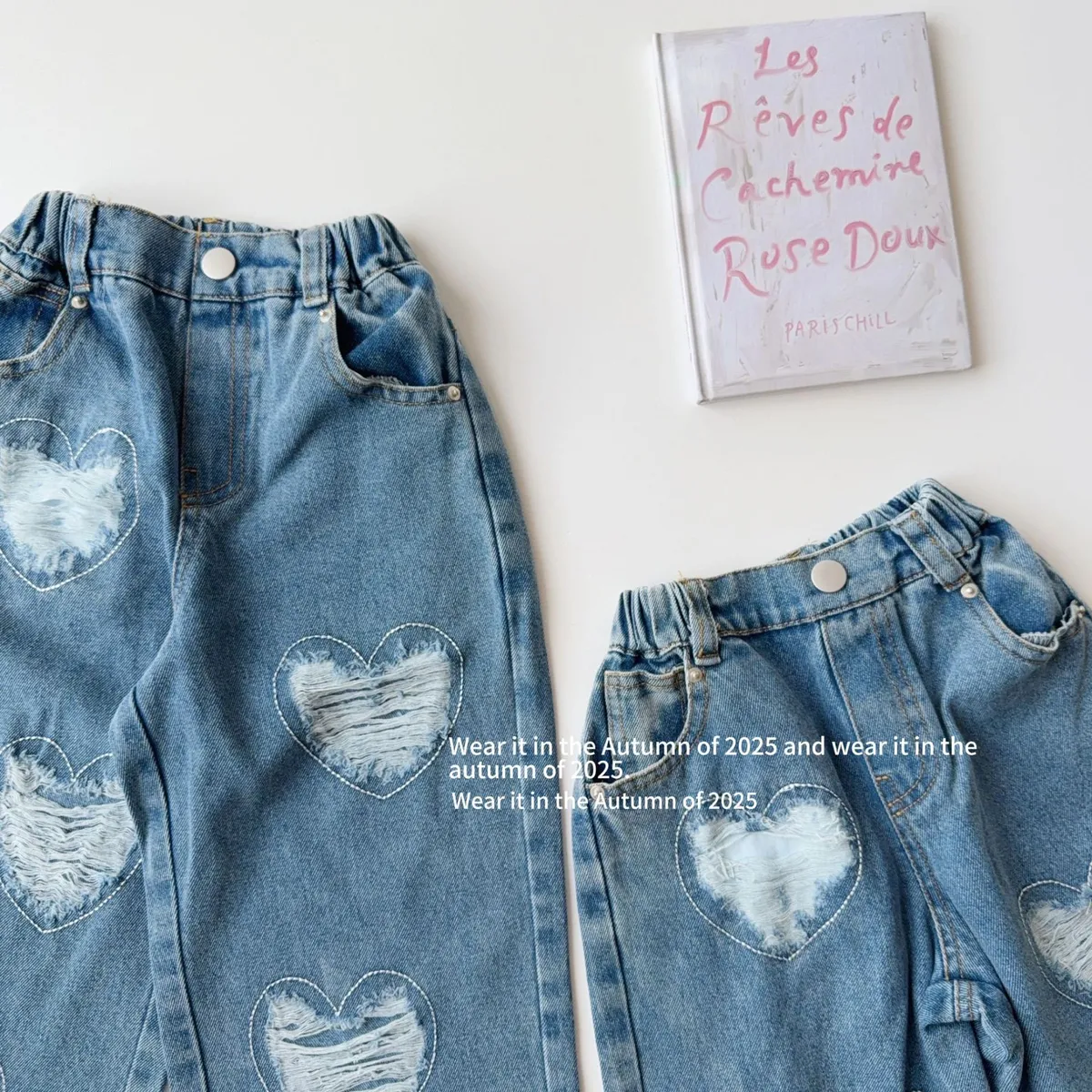 [90-150碼]設計感仿舊刷破愛心直筒褲