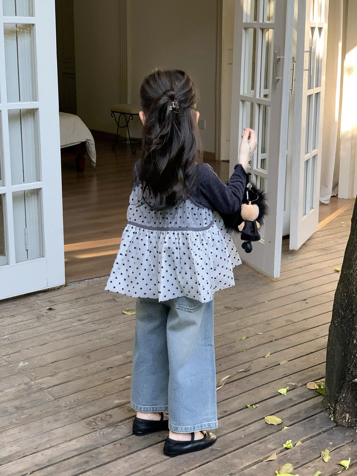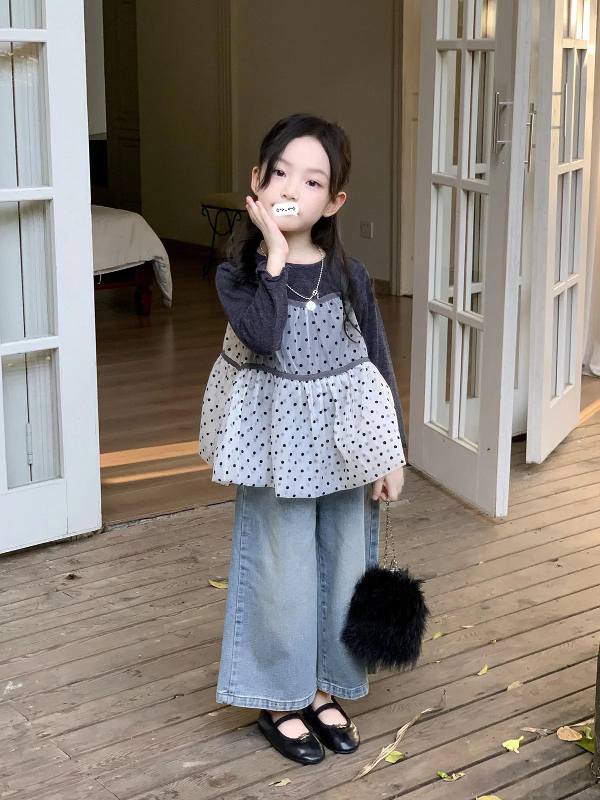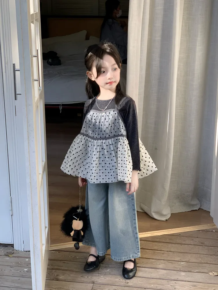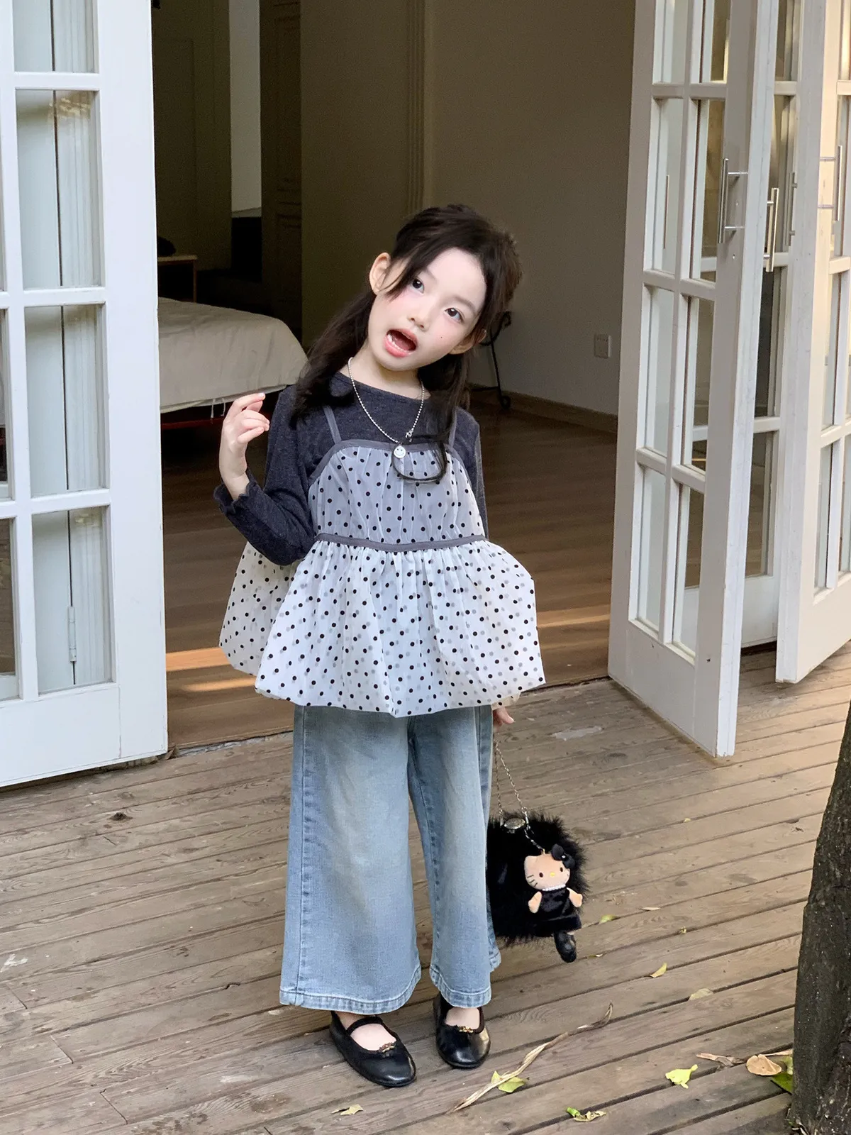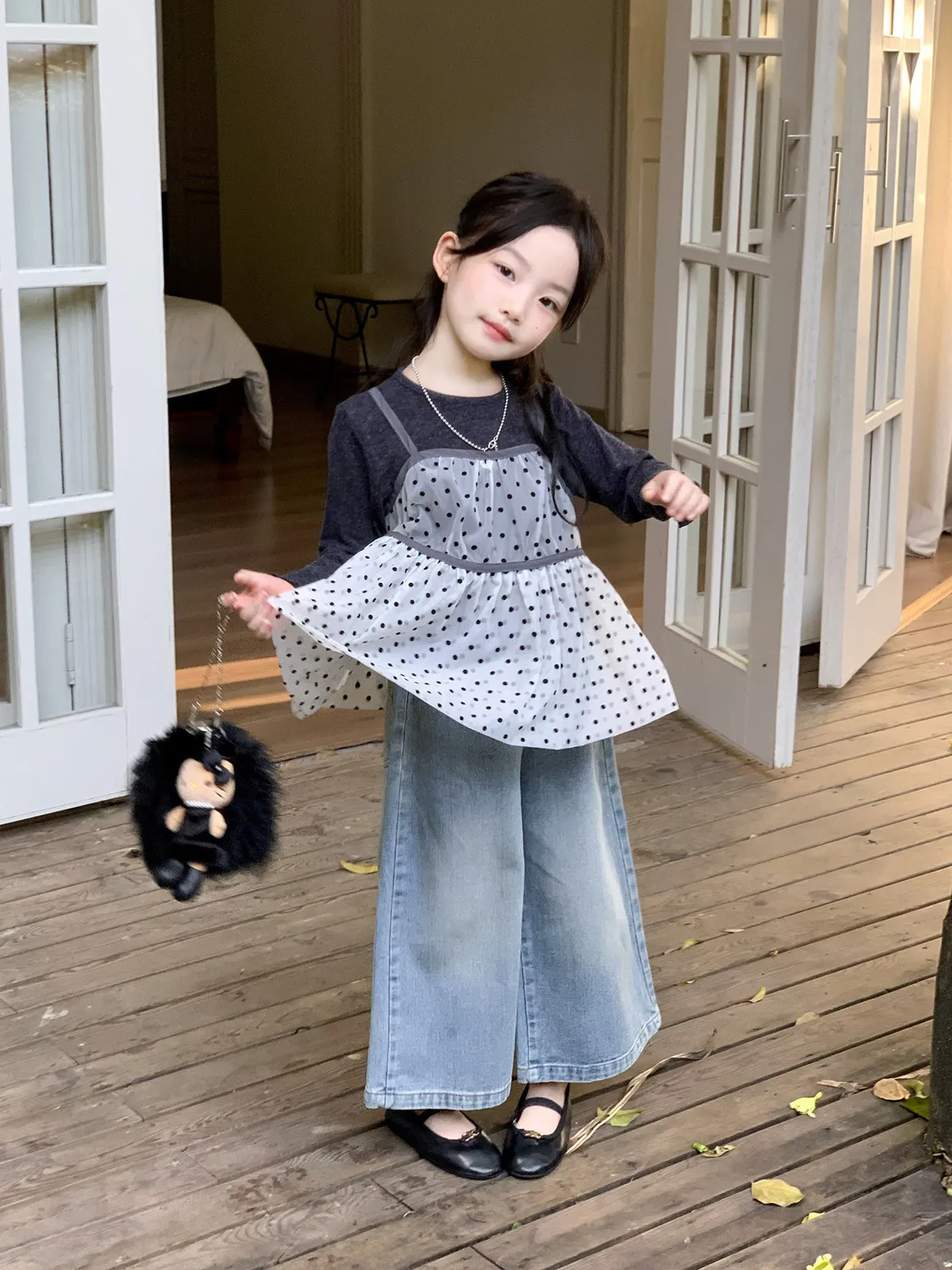 [90-140碼]日系疊穿兩件式圓點上衣/刷白牛仔寬褲