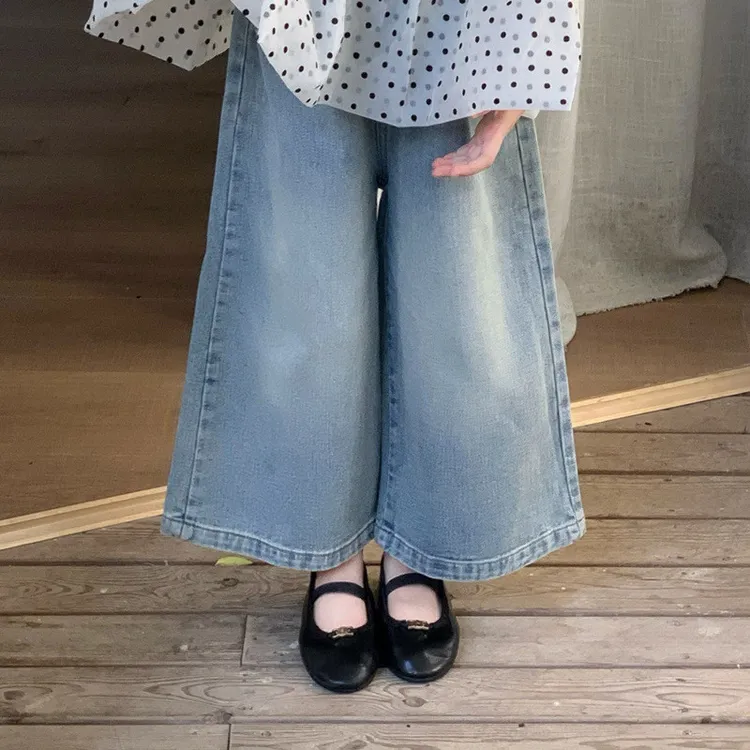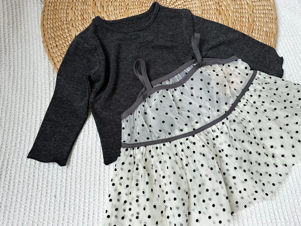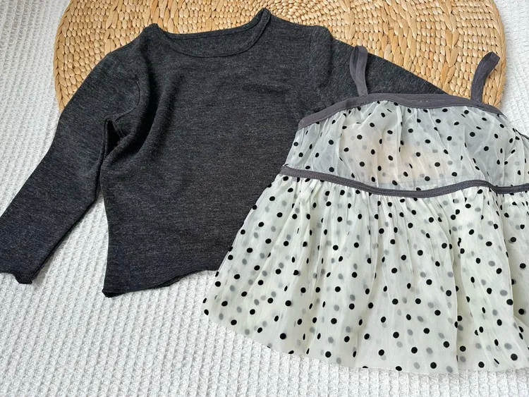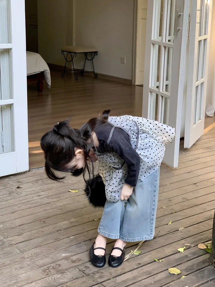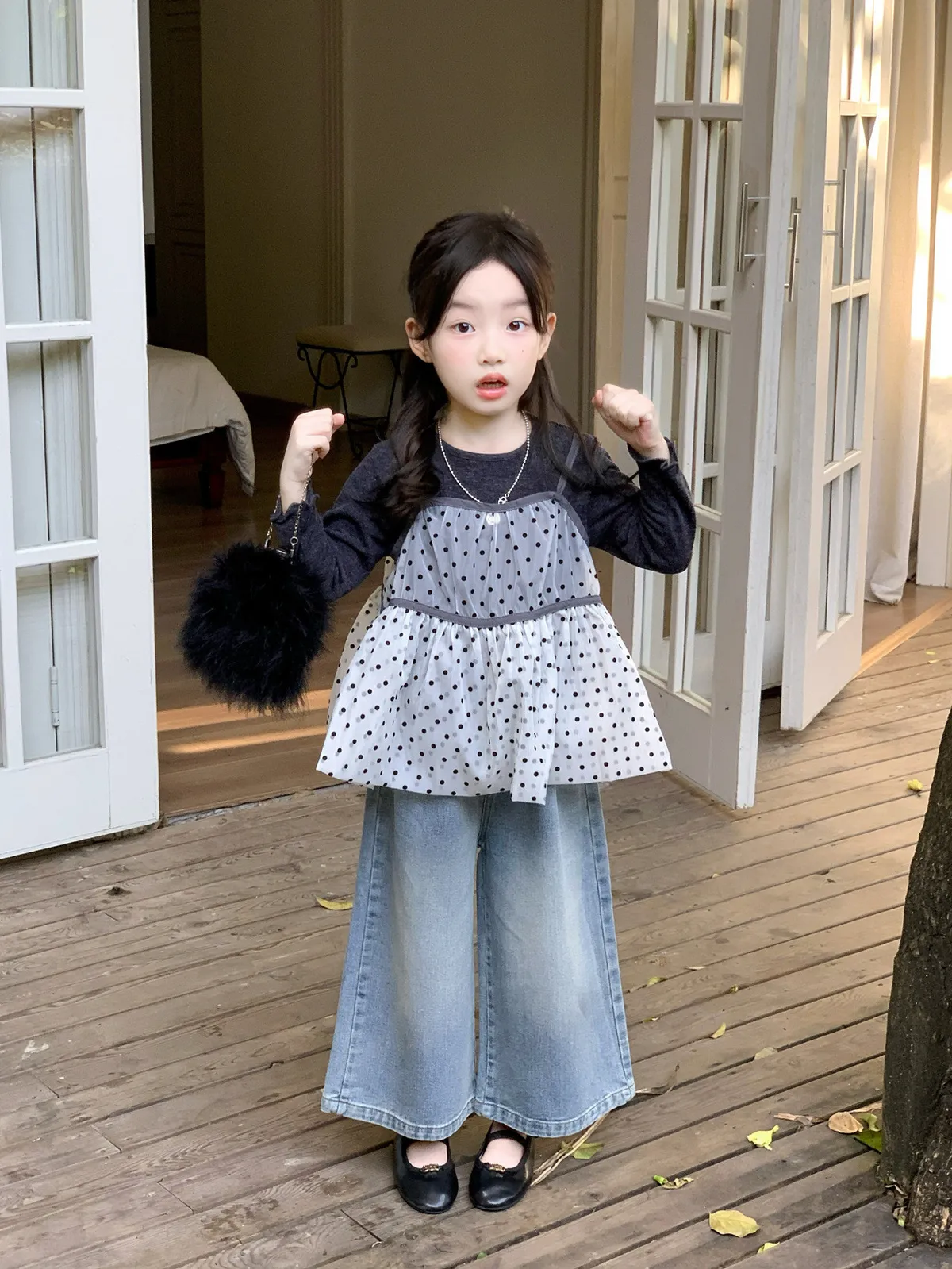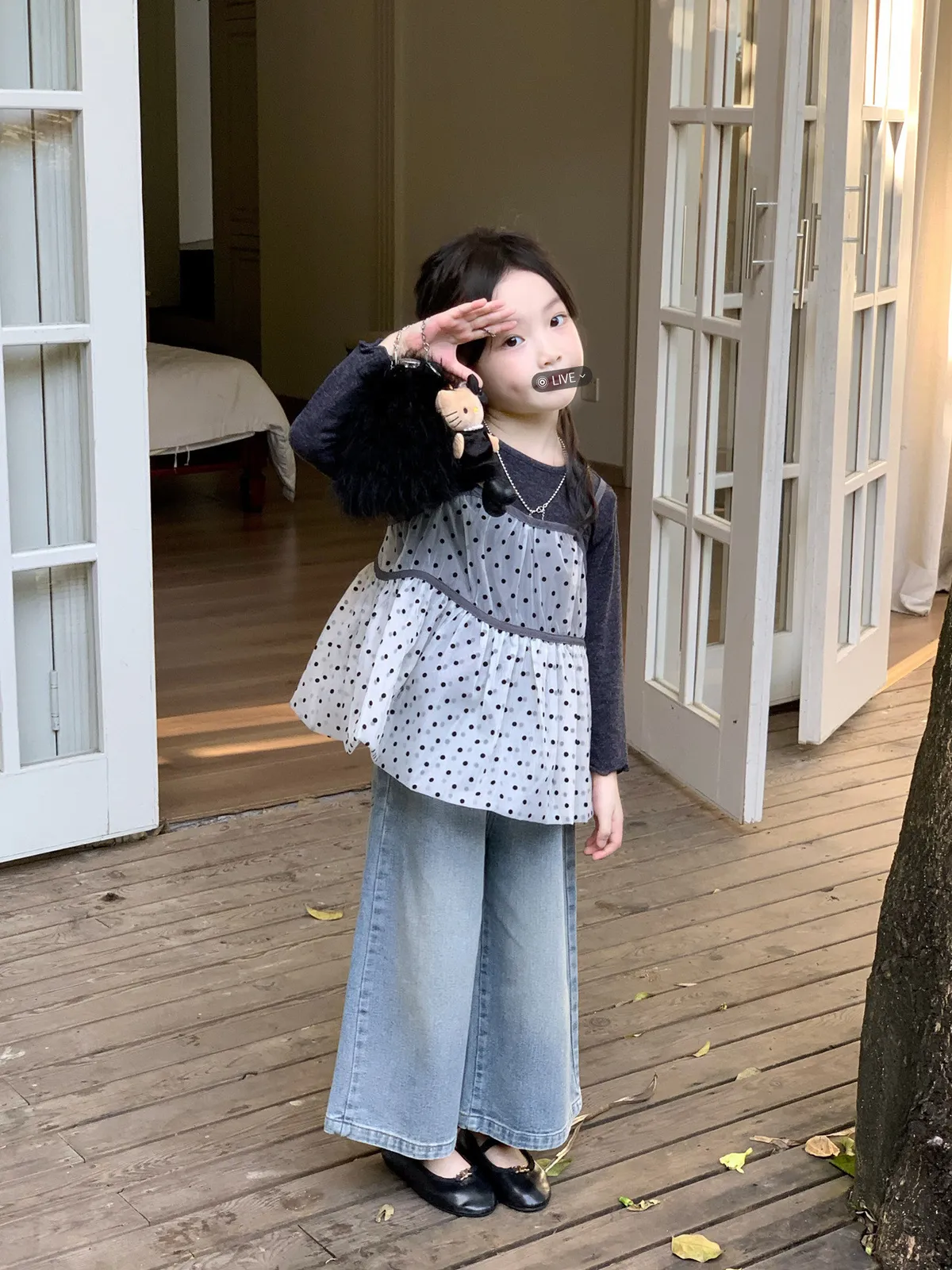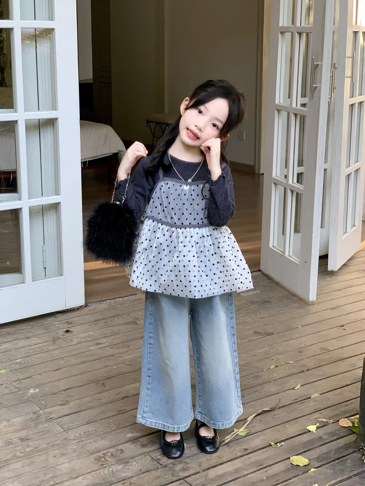 [90-140碼]日系疊穿兩件式圓點上衣/刷白牛仔寬褲