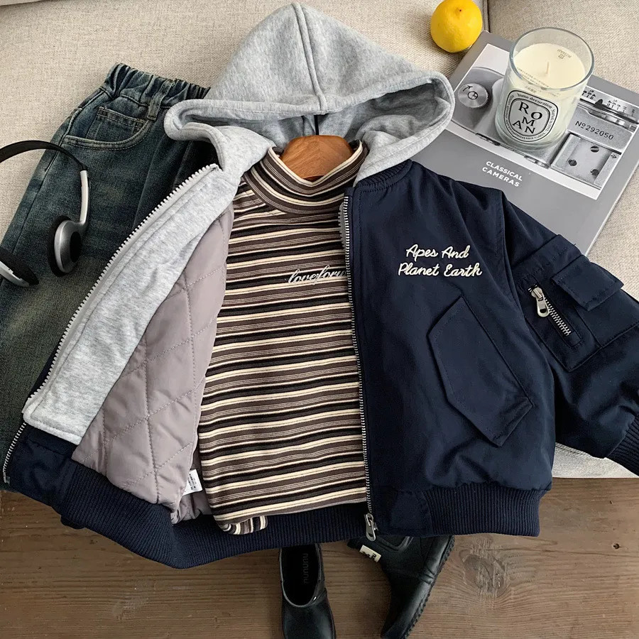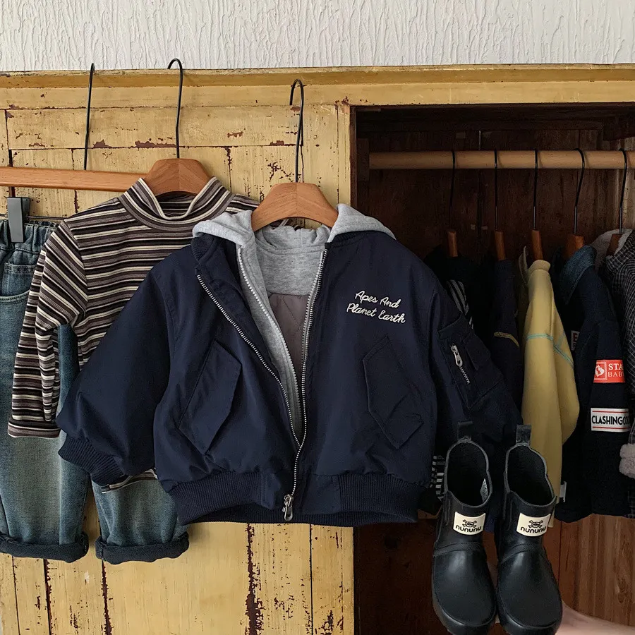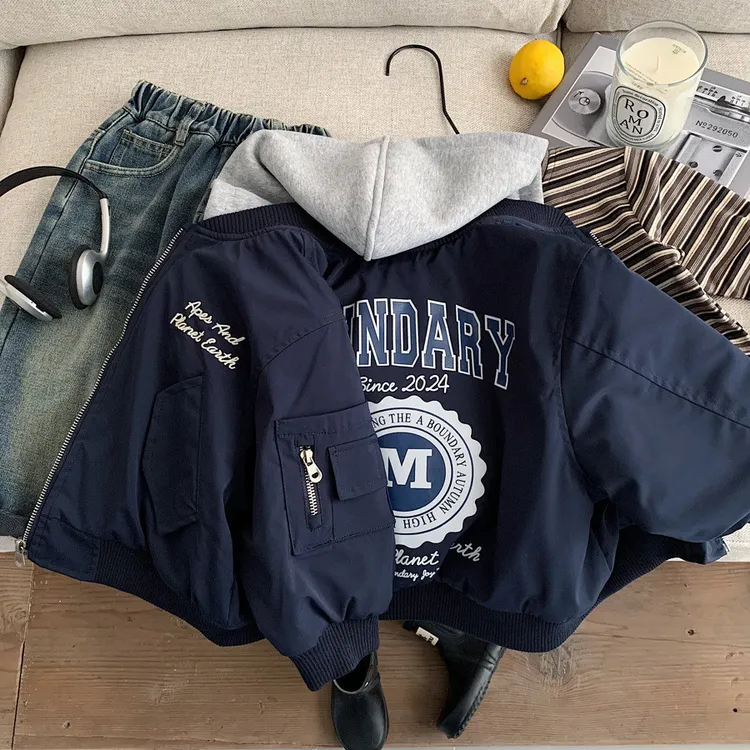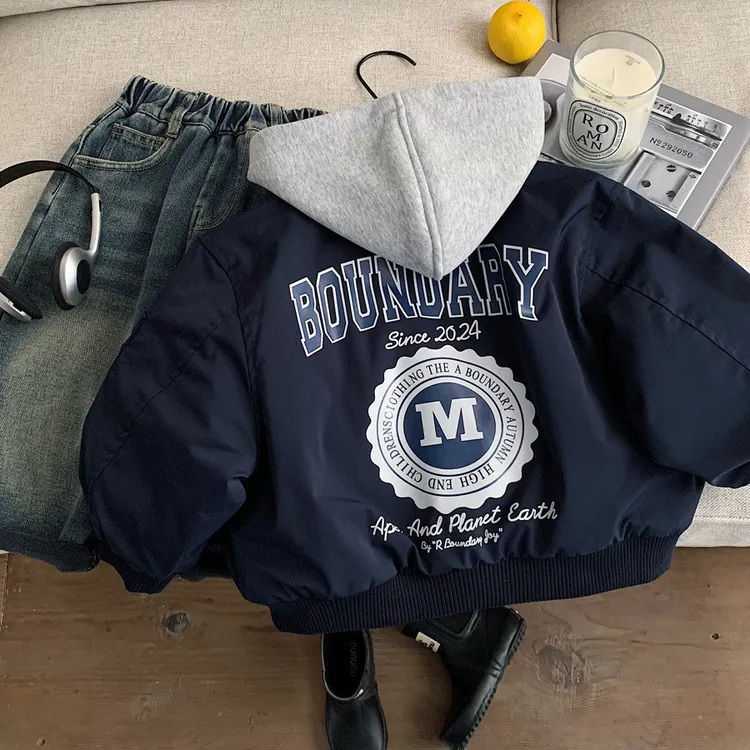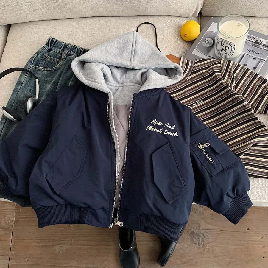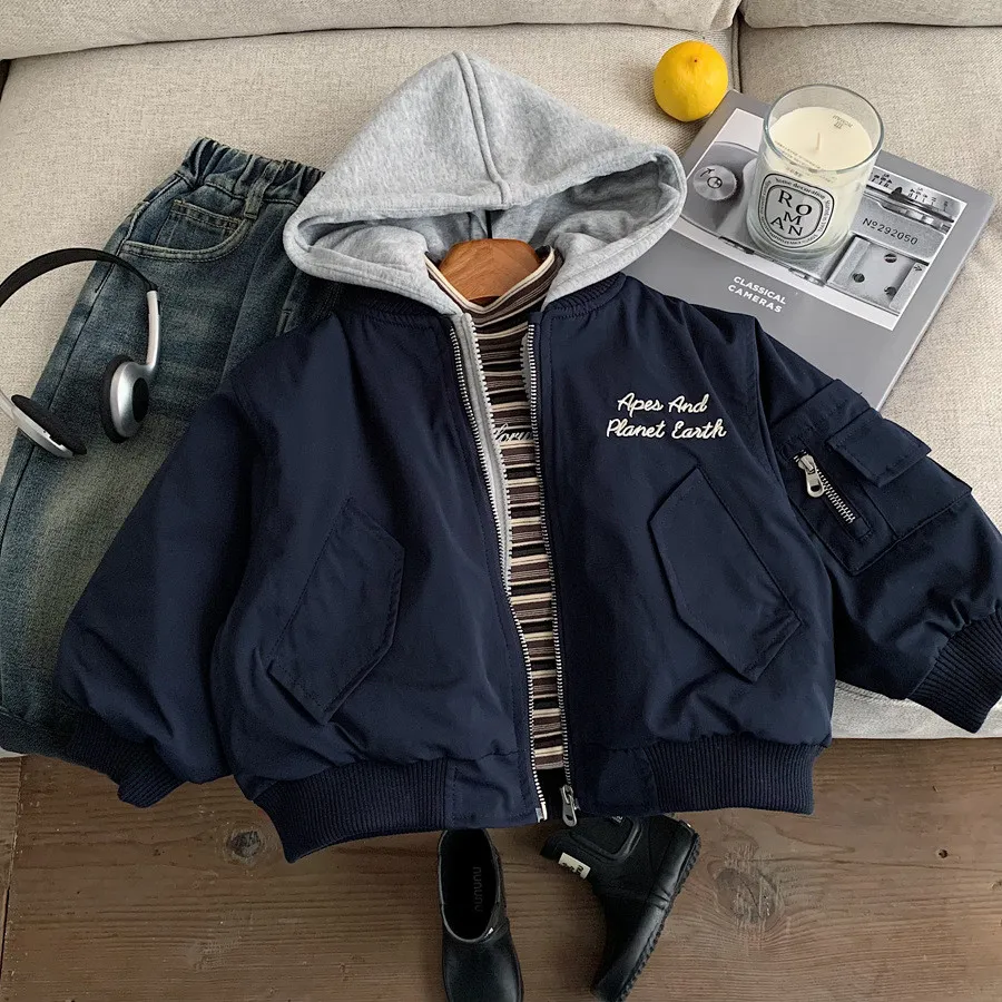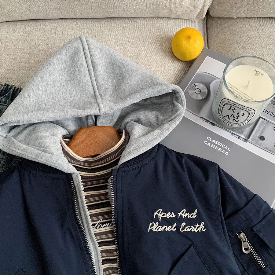 [90-140碼]刺繡字母拼接假兩件夾棉連帽外套