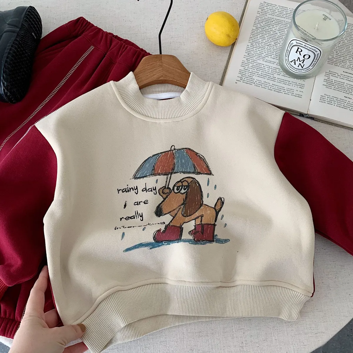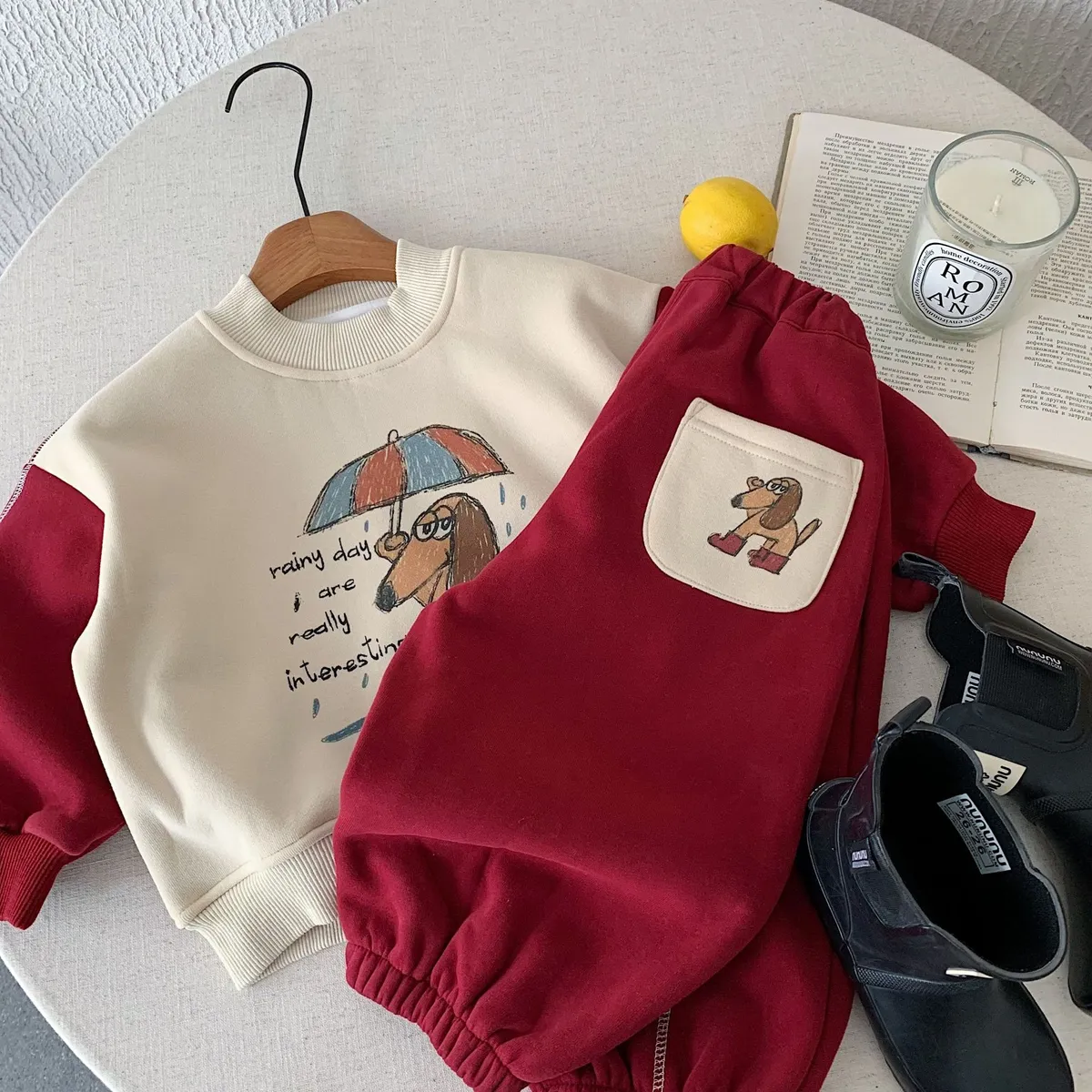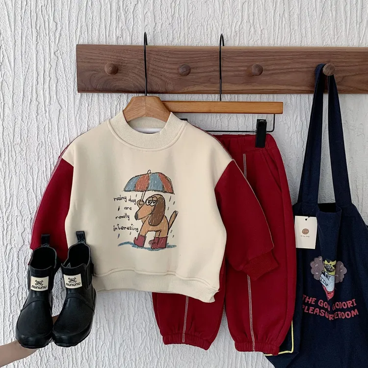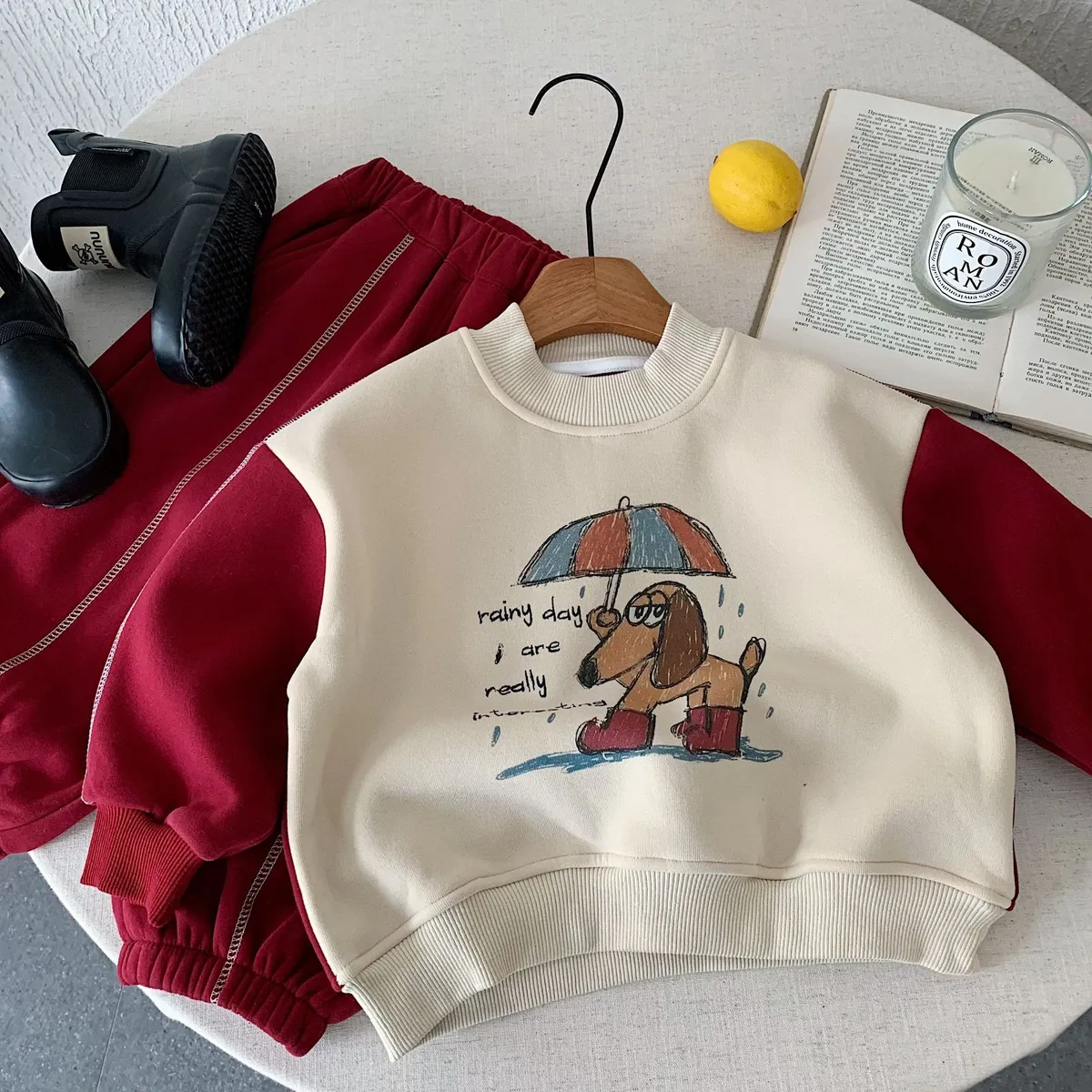 [90-130碼]加絨款#撐傘狗狗拼色運動套裝