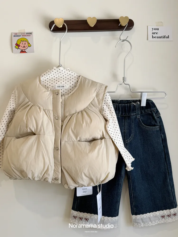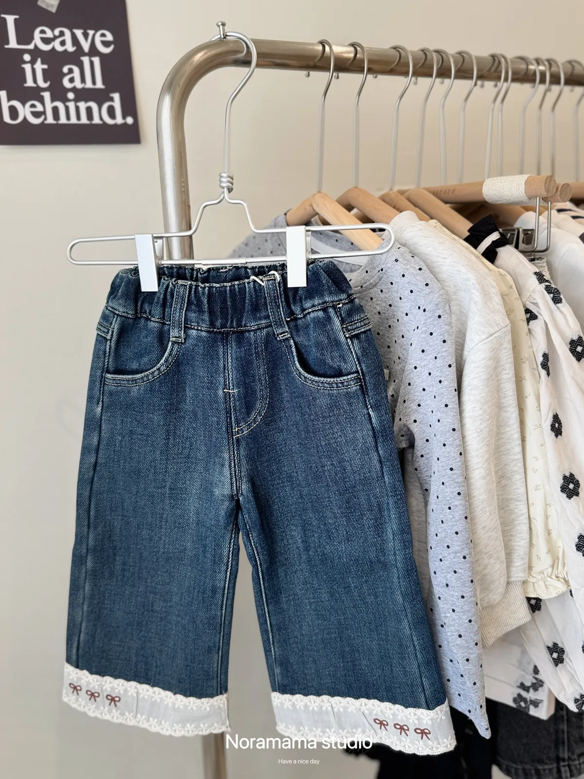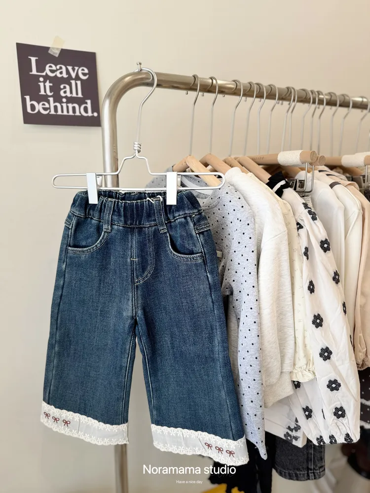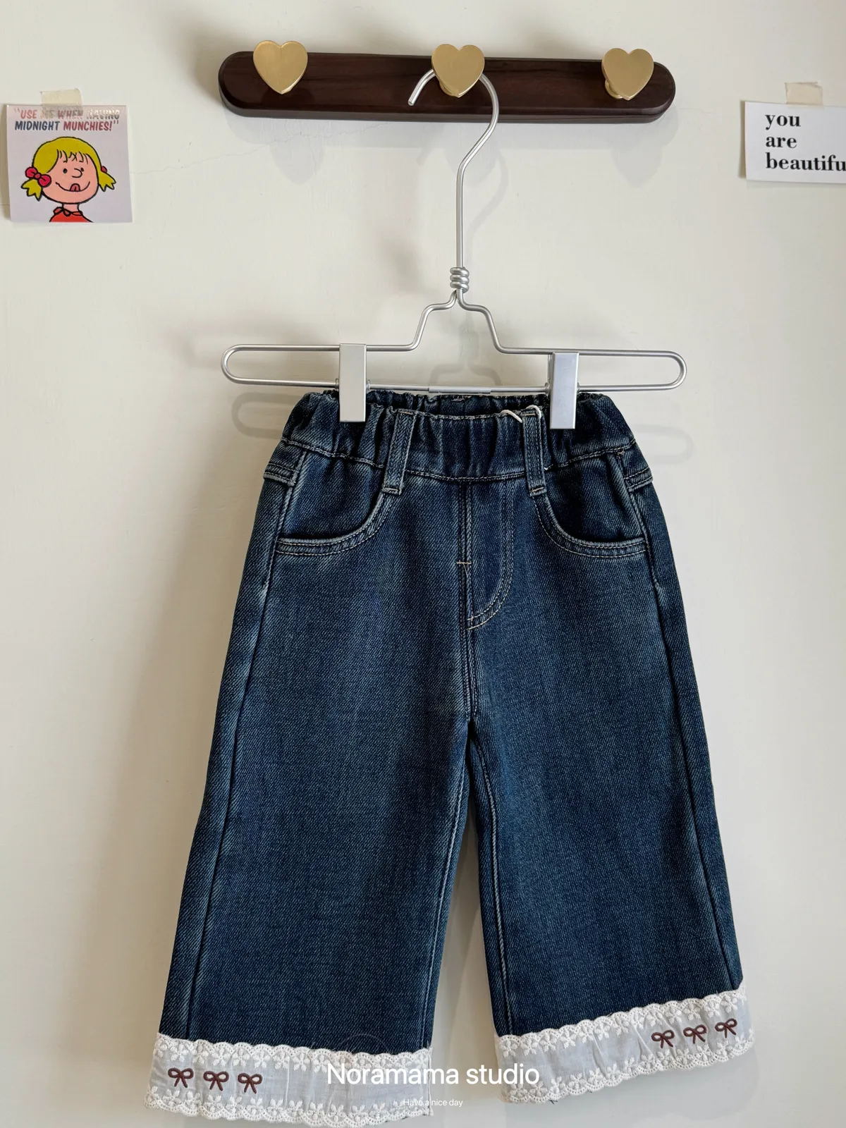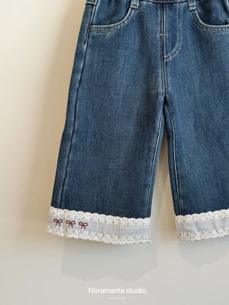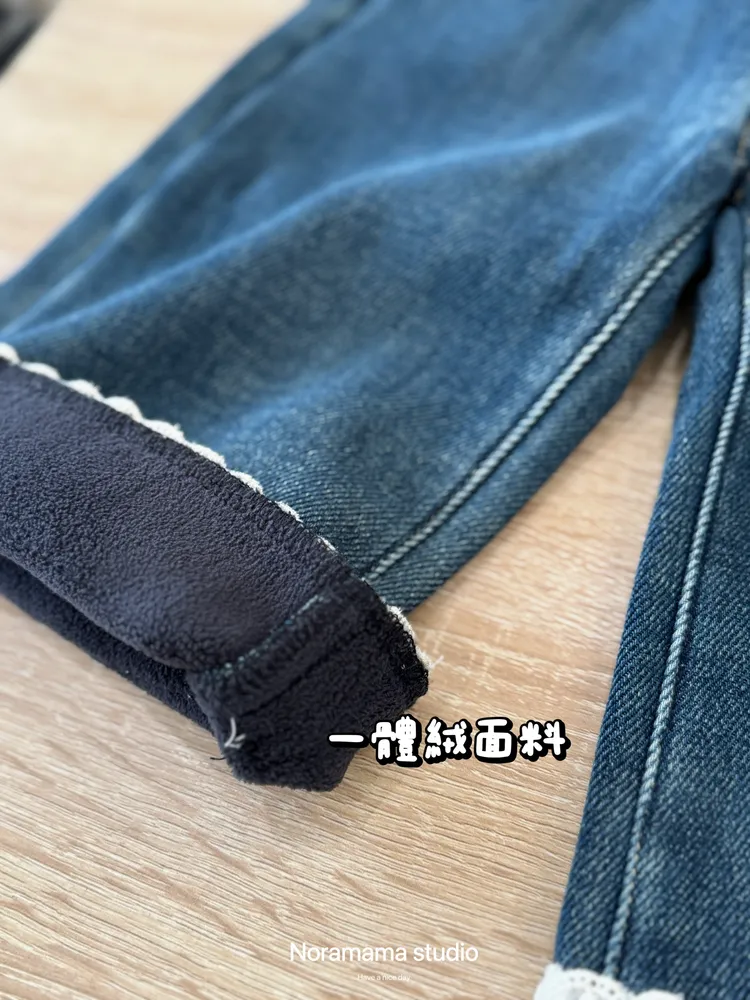 現貨/一體絨#下擺蕾絲花邊牛仔寬褲
