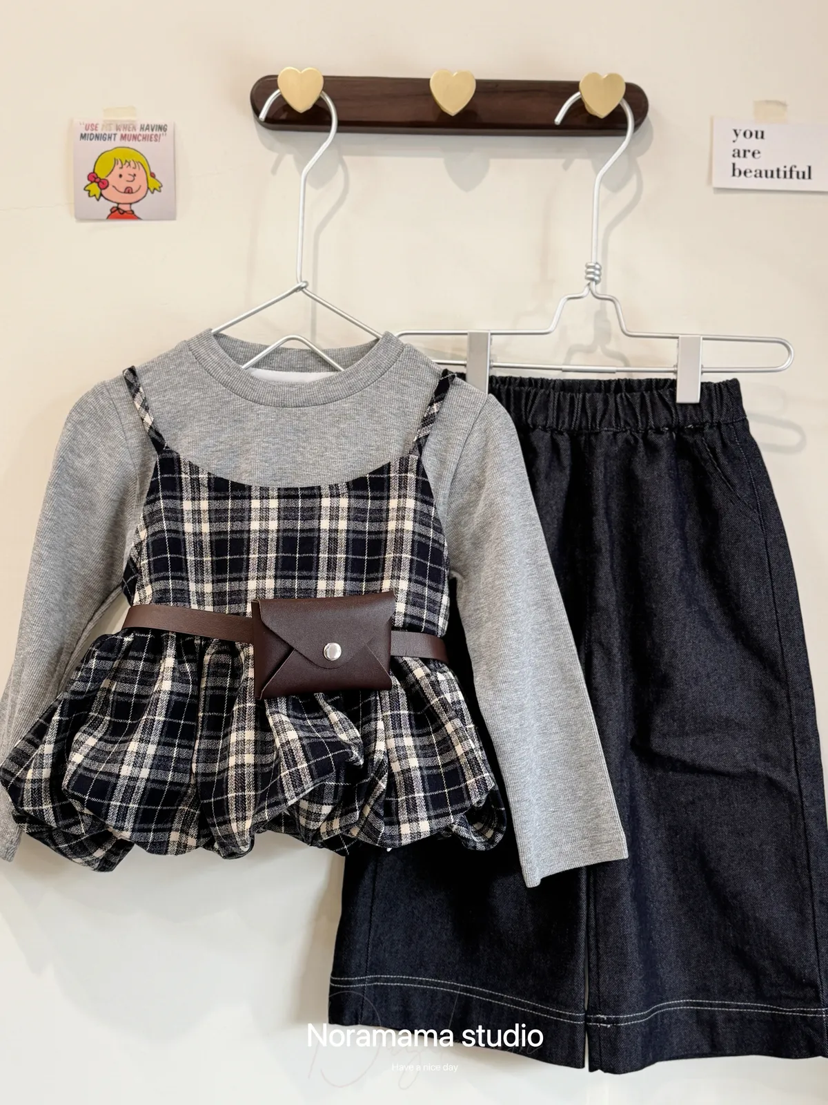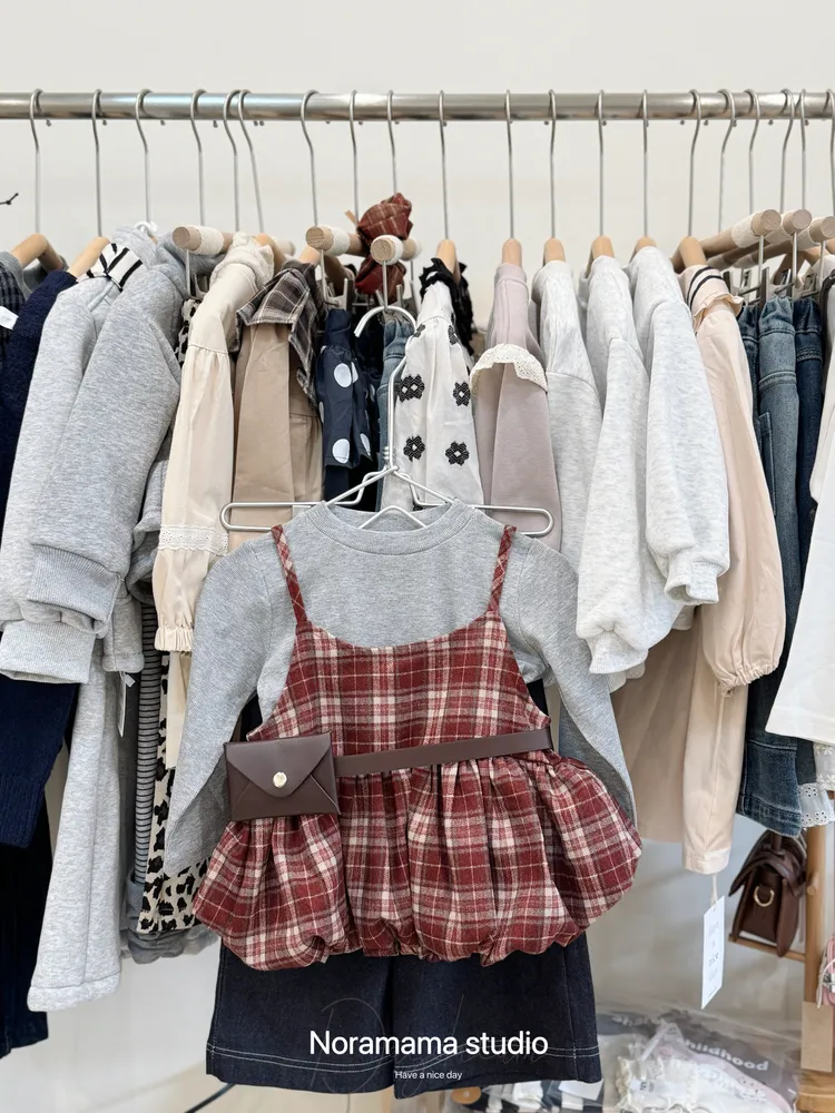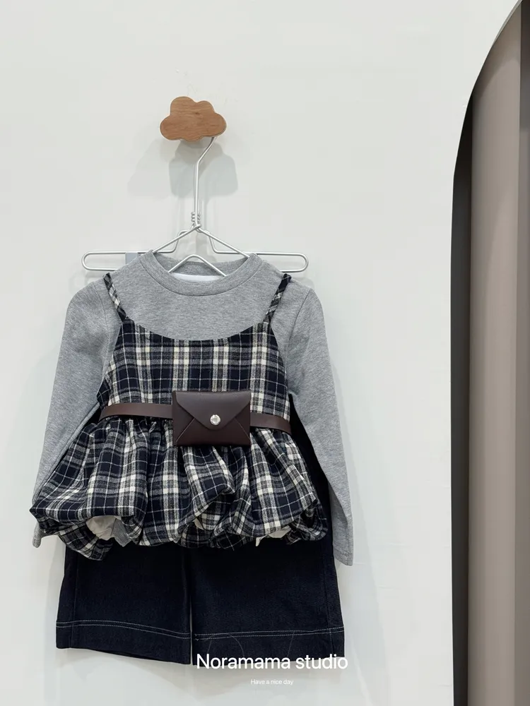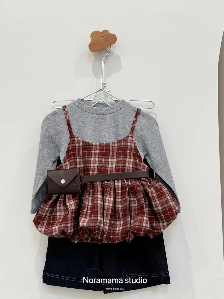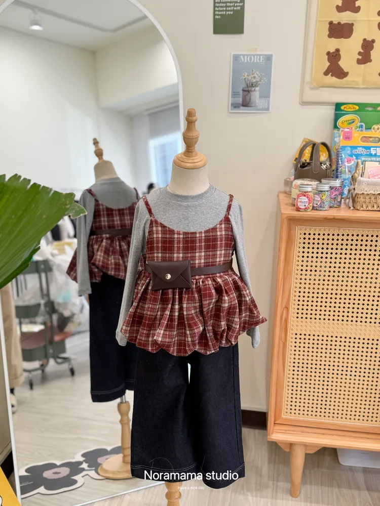 搭配復古格紋吊帶花苞罩衫