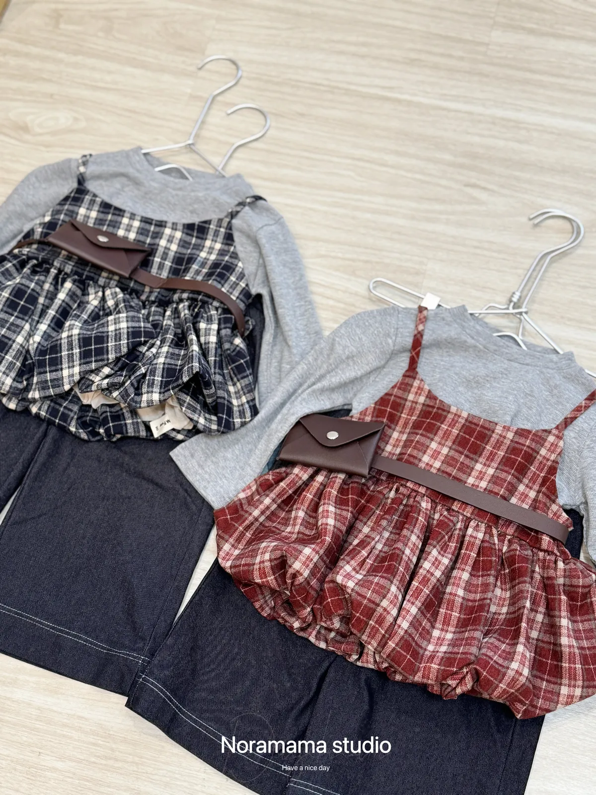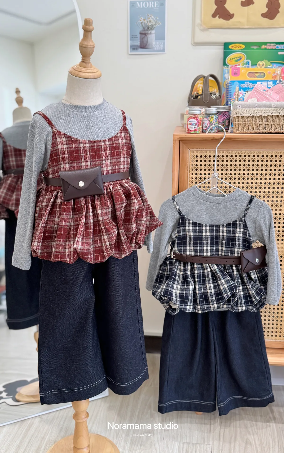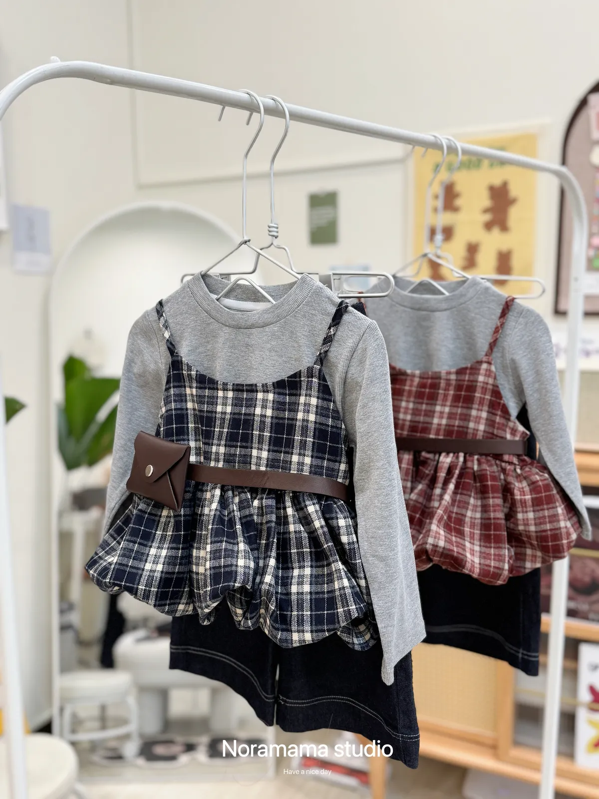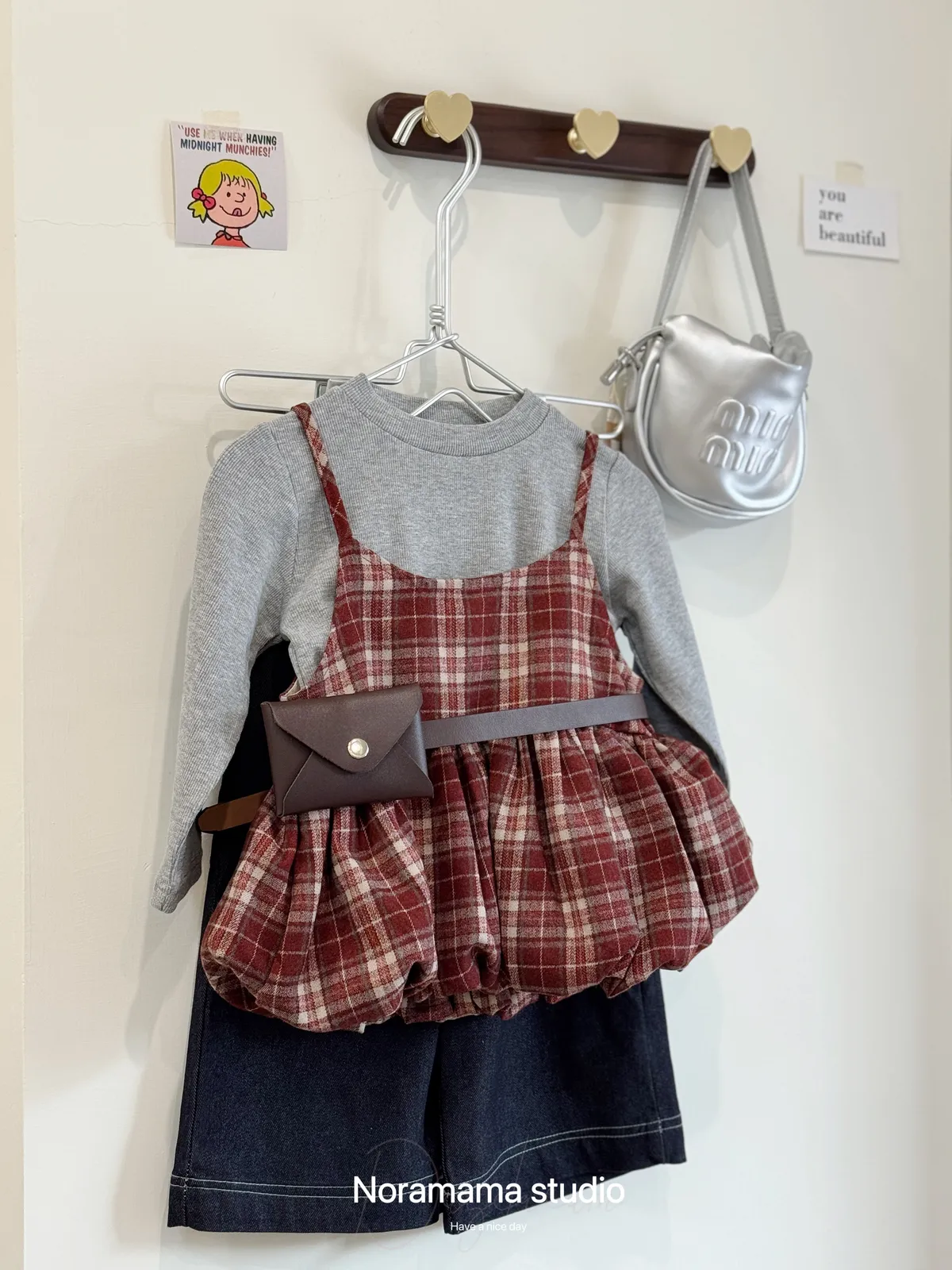 搭配復古格紋吊帶花苞罩衫