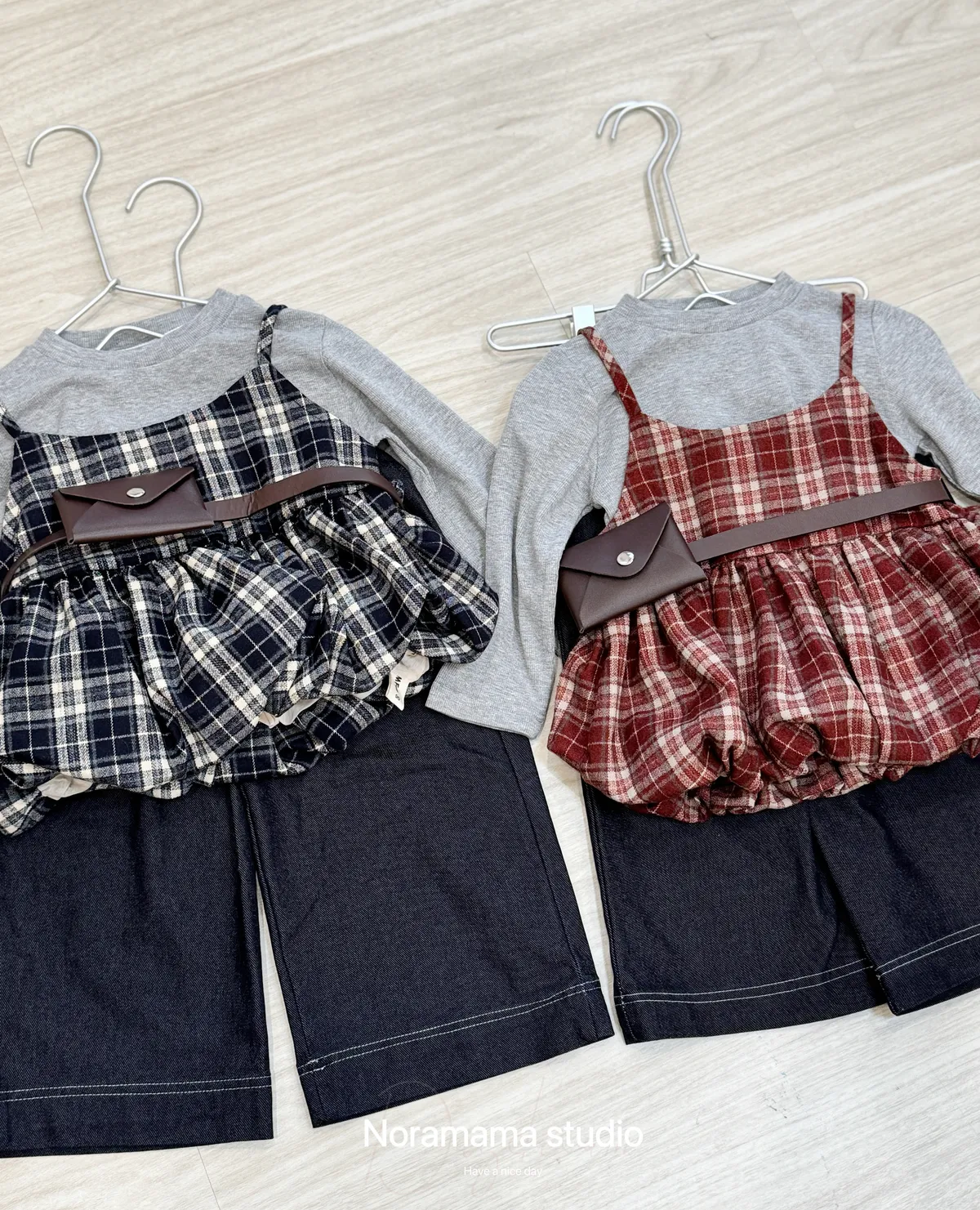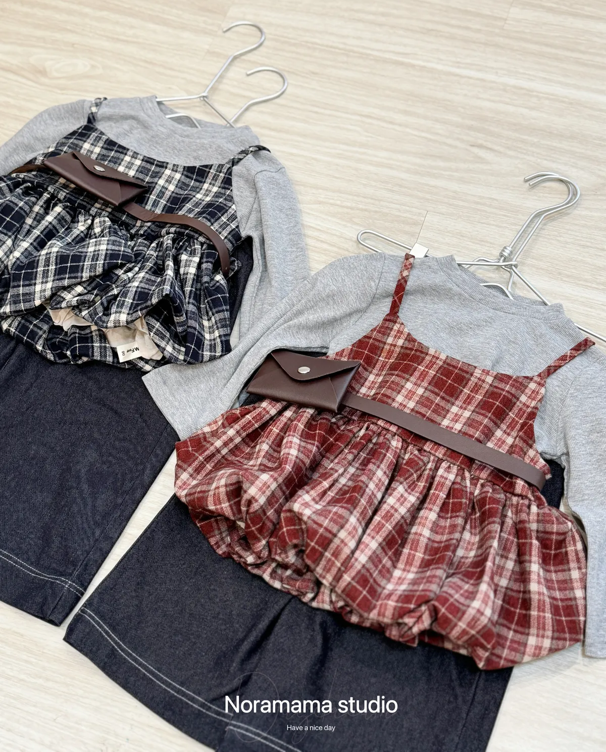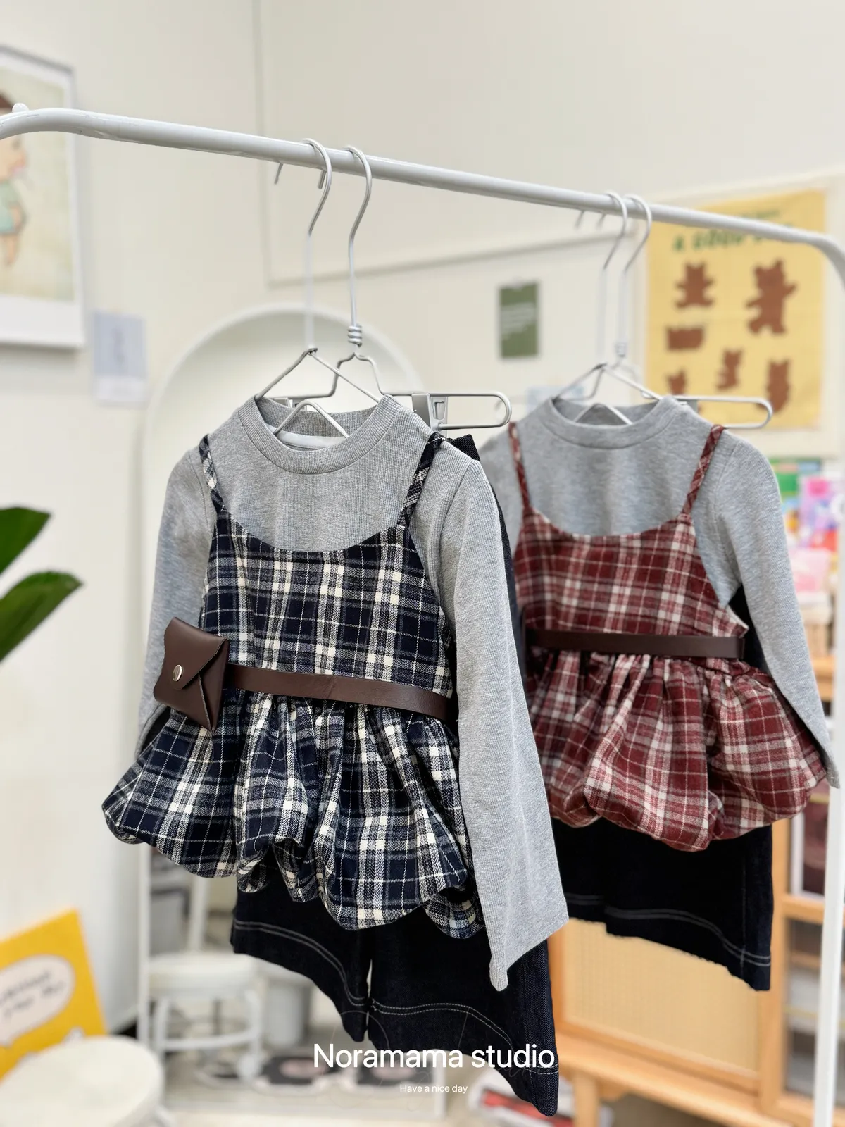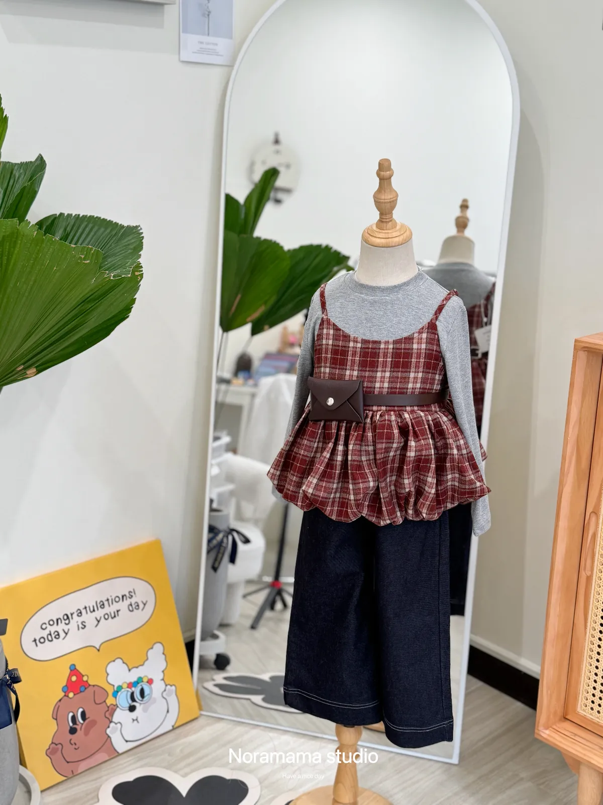 搭配復古格紋吊帶花苞罩衫