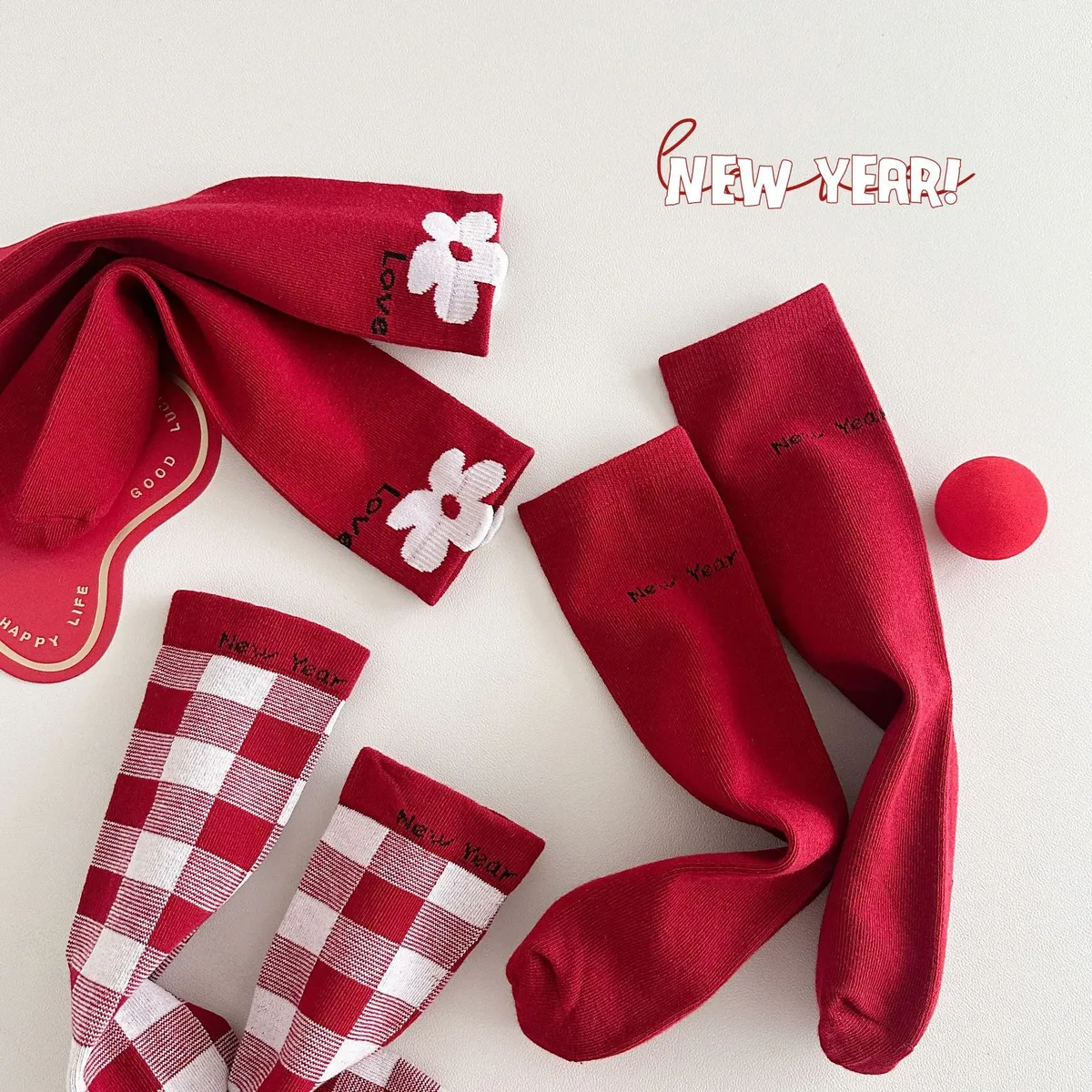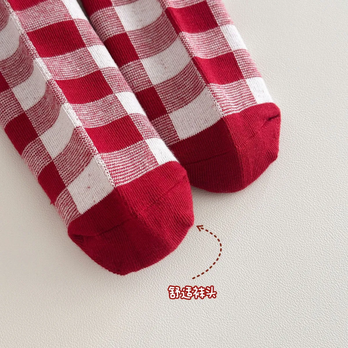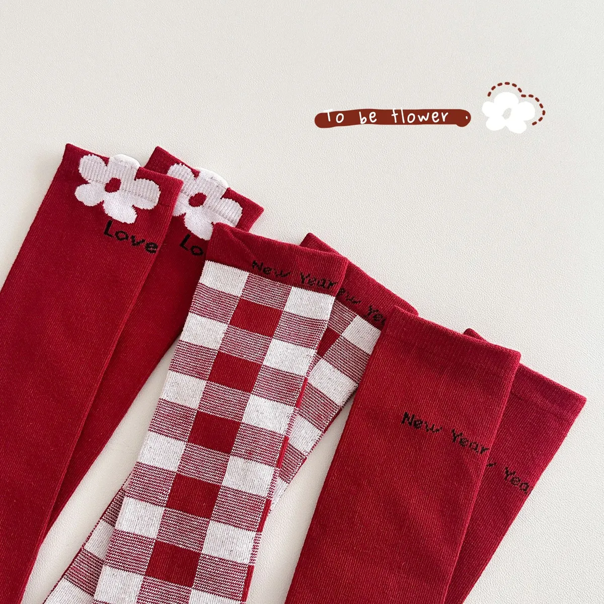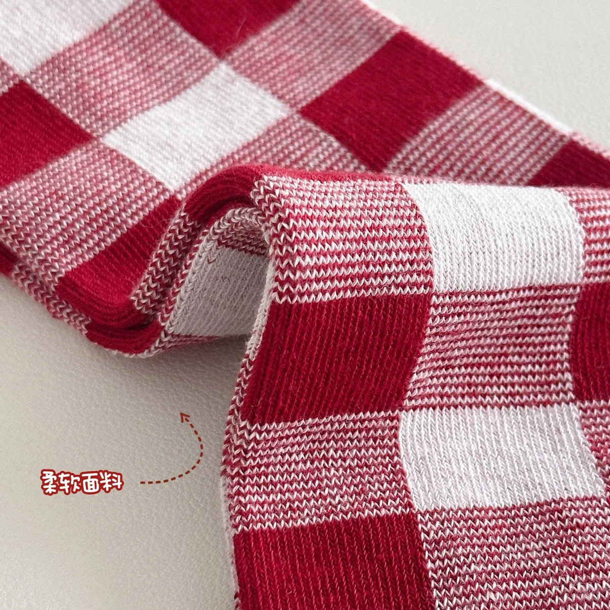 親子款#紅通通格紋花朵中筒襪(3入組)