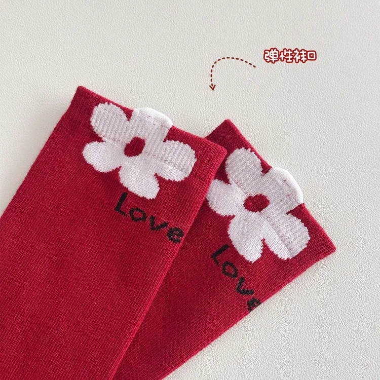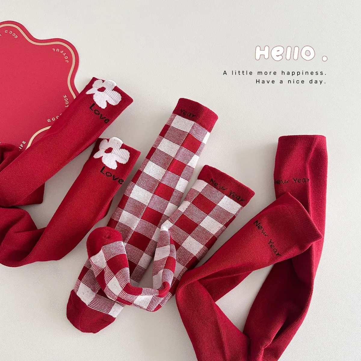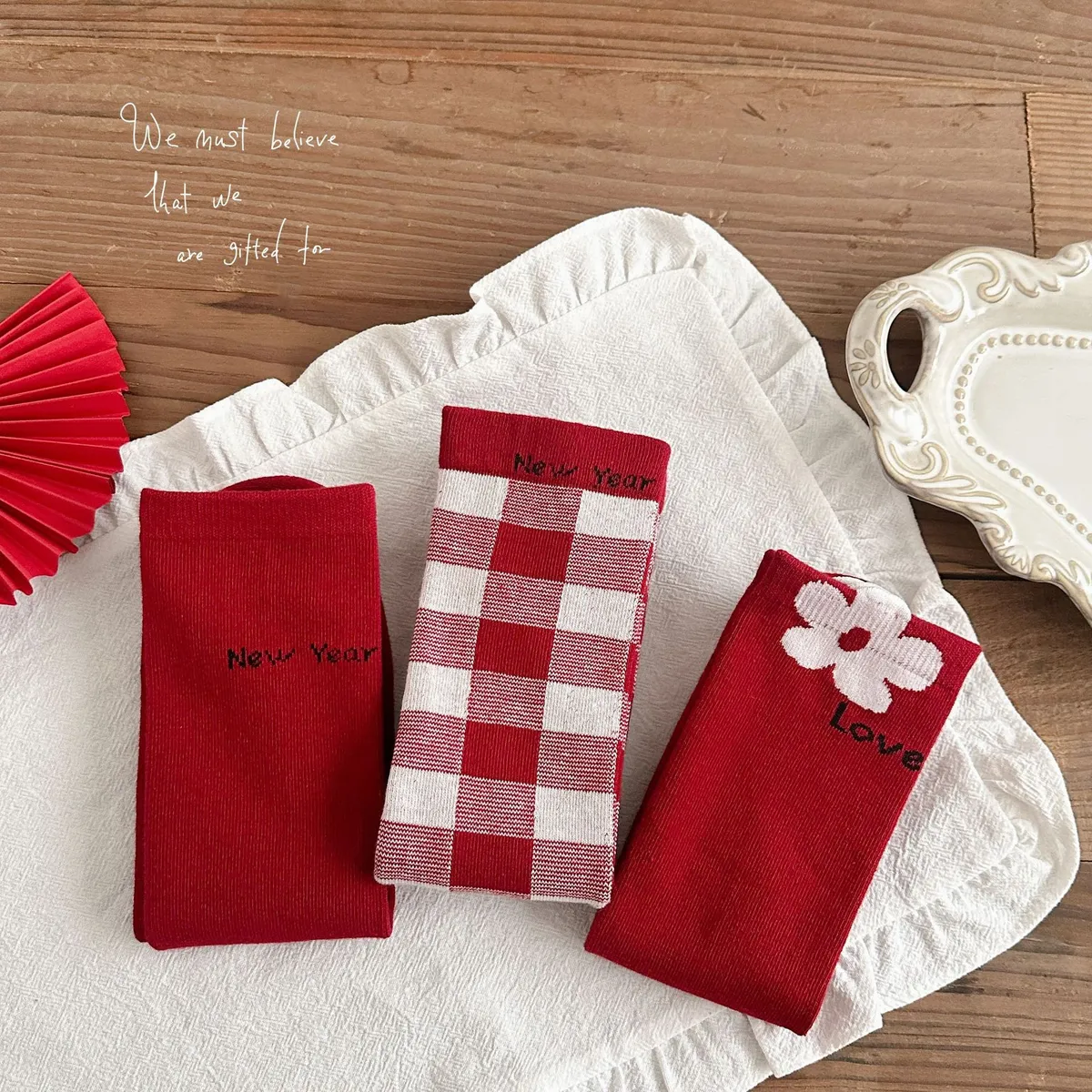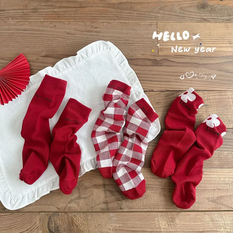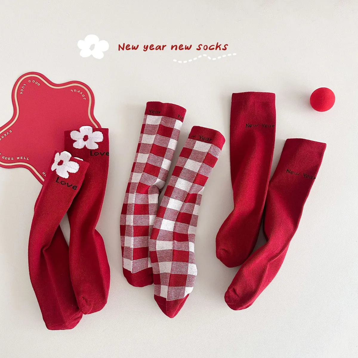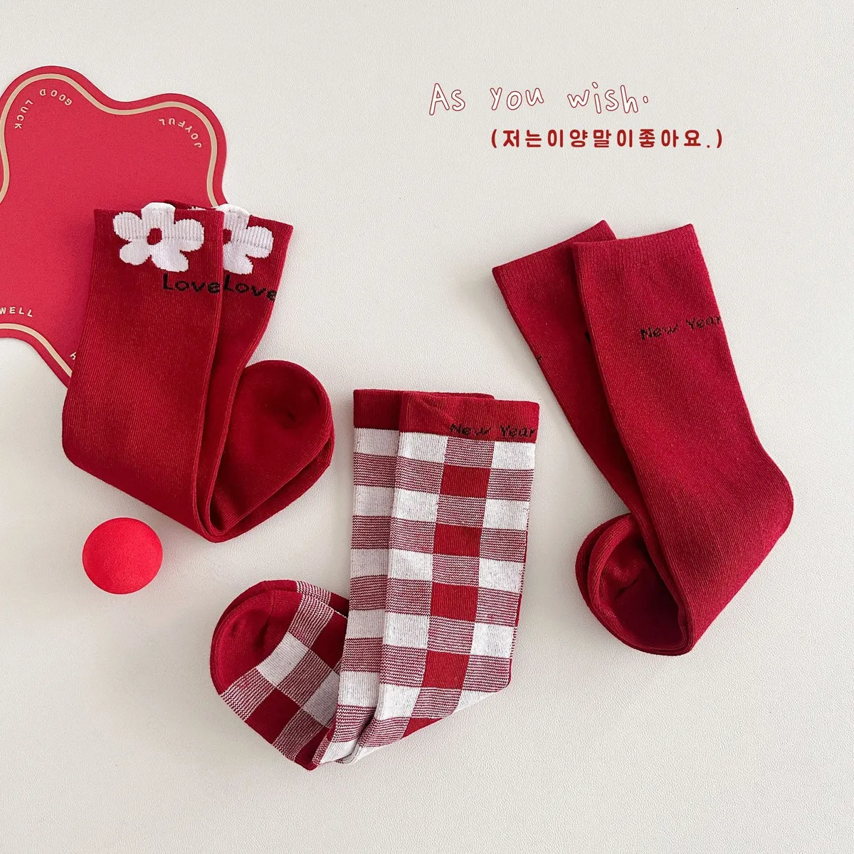 親子款#紅通通格紋花朵中筒襪(3入組)
